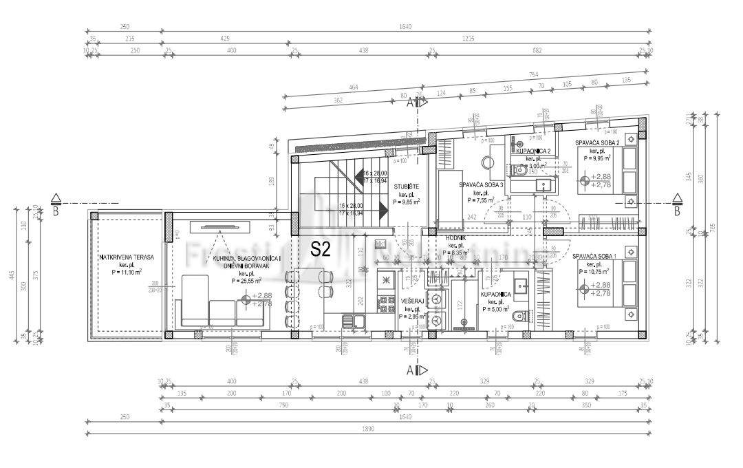 Na prvom katu Zgrade A nalazi se stan ”S-2" koji se pruža površinom od 88.50 m, a sastoji se od ulaznog hodnika, kupaonice, vešeraja, tri spavaće sobe od kojih jedna ima vlastitu kupanicu, kuhinje, blagavaonice i dnevnog boravka u "open space" izvedbi s izlazom na natkrivenu terasu.