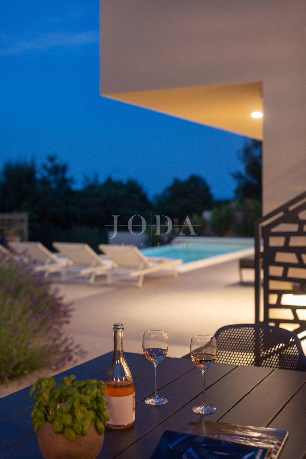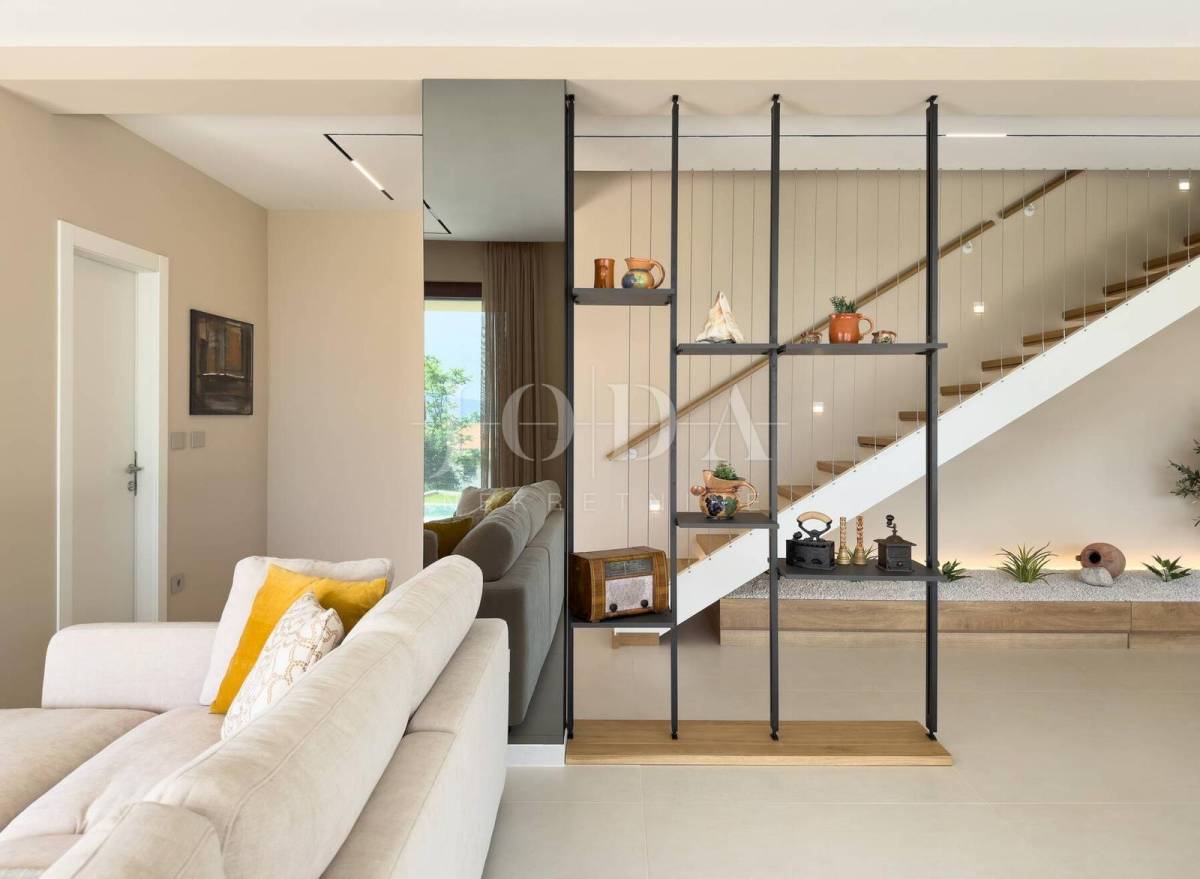 U prizemlju se nalazi moderna kuhinja sa blagovaonicom, veliki dnevni boravak, 2 spremišta, praonica i gostinjski wc. Velike staklene stijene protežu se uz duž fasade pa se stvara još bolji doživljaj povezanosti s prirodom. Izlazak iz vile vodi vas do popločane terase sa sunčalištem te preljevnim bazenom. U izgradnji je također i ljetna kuhinja te prostor za blagovanje i druženje.