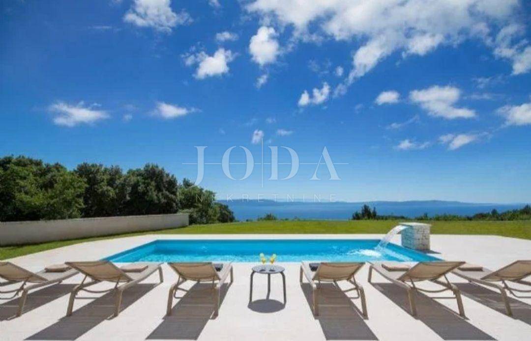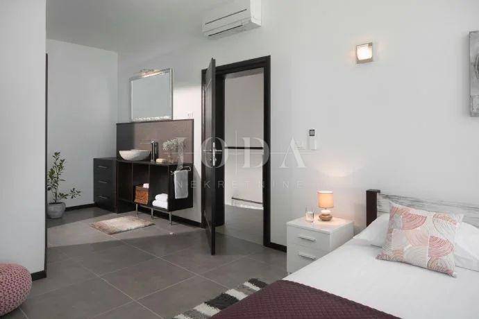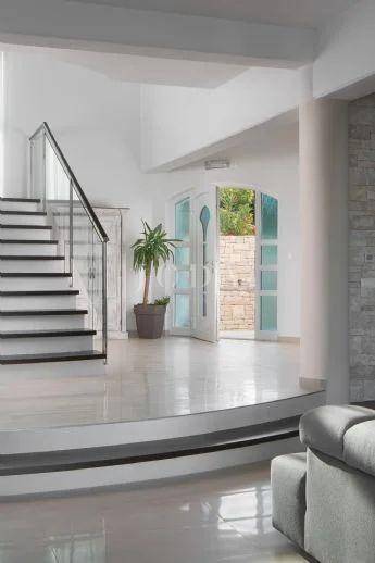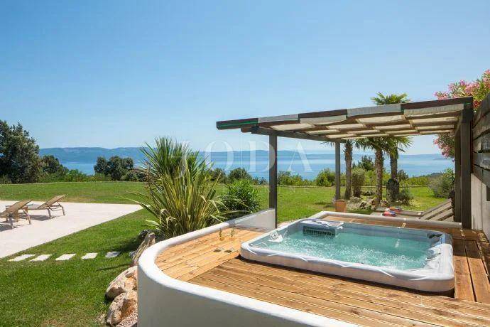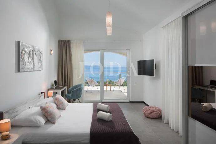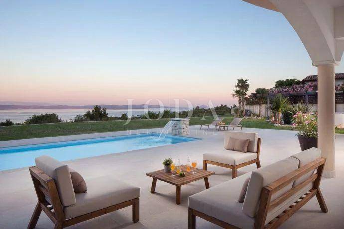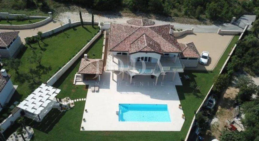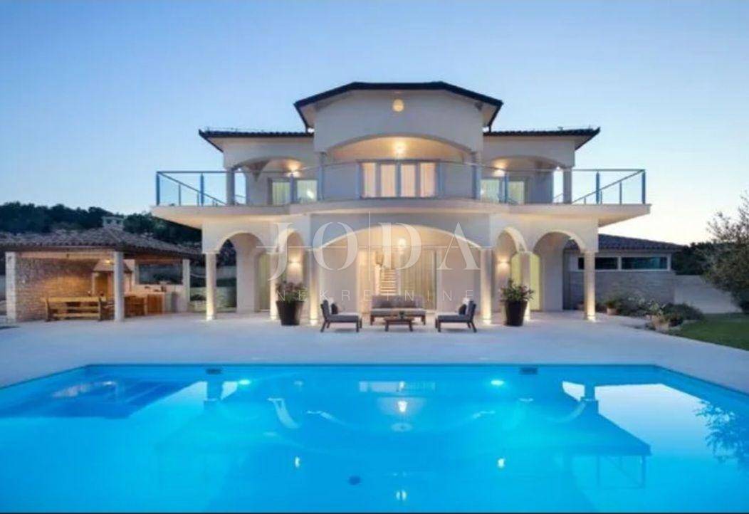 Luksuzna vila površine 1650m2 s nesmetanim pogledom na more i prirodu. Imanje je udaljeno 5 minuta vožnje do mora. Vila ima bruto stambenu površinu od 360m2 sa dvije etaže i više terasa. Svaka soba sa svojim tuš/WC, izlaz na veliku natkrivenu terasu. U prizemlju se nalazi dnevni boravak s kaminom, elegantnom kuhinjom, WC za goste, ostave i kupaonice. Sve sobe imaju podno grijanje i klimatizirane su. Kuća je kompletno namještena. U sklopu vile gostima su na raspolaganju vlastiti bazen, vanjski roštilj, vrt i privatno parkiralište.