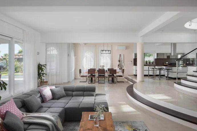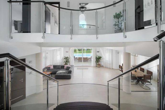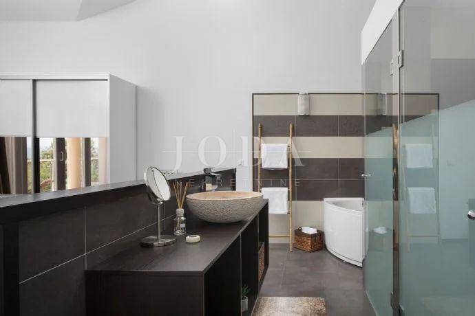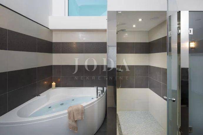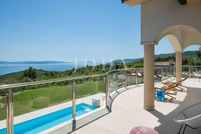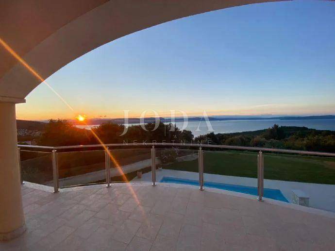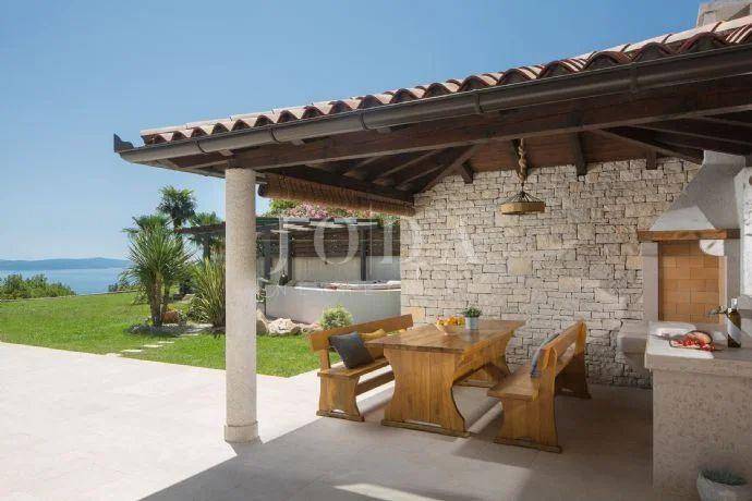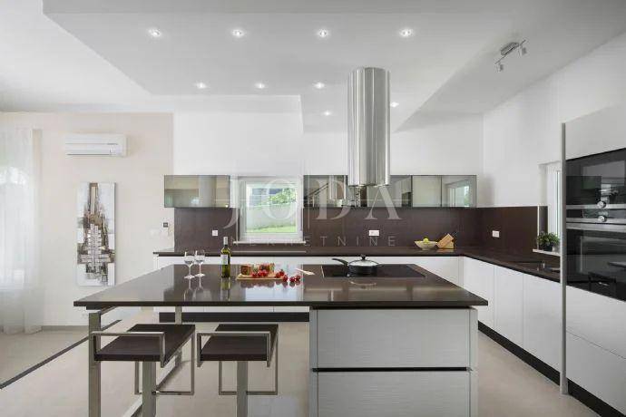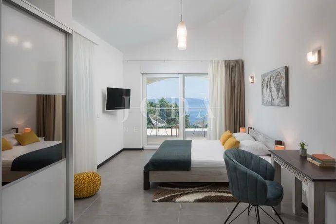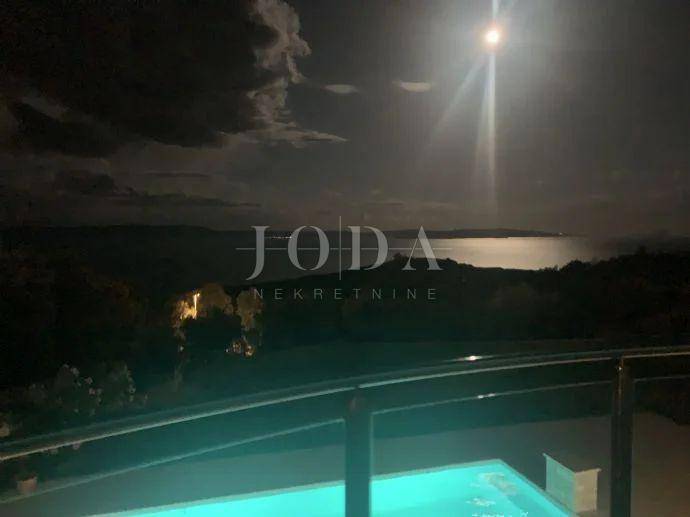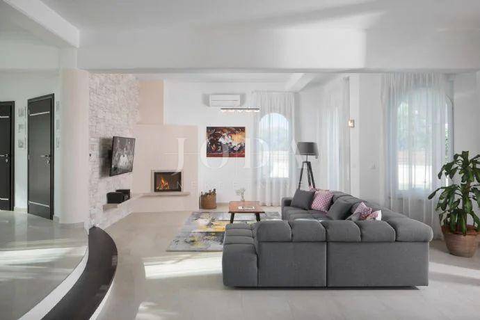 Luksuzna vila površine 1650m2 s nesmetanim pogledom na more i prirodu. Imanje je udaljeno 5 minuta vožnje do mora. Vila ima bruto stambenu površinu od 360m2 sa dvije etaže i više terasa. Svaka soba sa svojim tuš/WC, izlaz na veliku natkrivenu terasu. U prizemlju se nalazi dnevni boravak s kaminom, elegantnom kuhinjom, WC za goste, ostave i kupaonice. Sve sobe imaju podno grijanje i klimatizirane su. Kuća je kompletno namještena. U sklopu vile gostima su na raspolaganju vlastiti bazen, vanjski roštilj, vrt i privatno parkiralište.