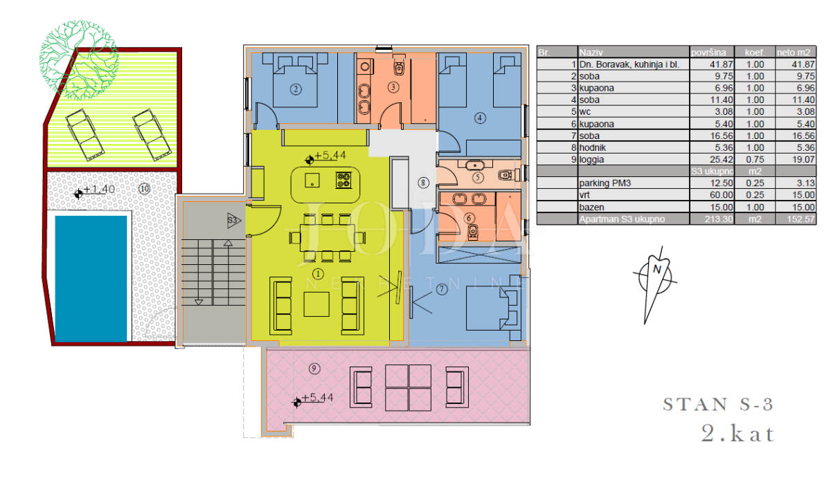 Penthouse je površine 113 m2 i sastoji se od hodnika, dnevnog boravka, kuhinje i blagovaone, tri spavaće sobe, dvije kupaonice, WC-a te velike natkrivene terase s pogledom na more. Pripada mu i lijepo uređen vrt na kojem se nalazi bazen i sunčalište. U izgradnji ove apartmanske ville koristili su se najkvalitetniji materijali i oprema. Neke od opreme su aluminijska stolarija, fasada od kamena, staklene ograde u kombinaciji s prirodnim kamenom, luksuzni parket u kombinaciji s prekrasnim zidnim tapetama i pomno odabranim rasvjetnim tijelima te vrhunski kupaonski namještaj i sanitarije. Obratila se pozornost na svaki detalj u uređenju ovog luksuznog stana.