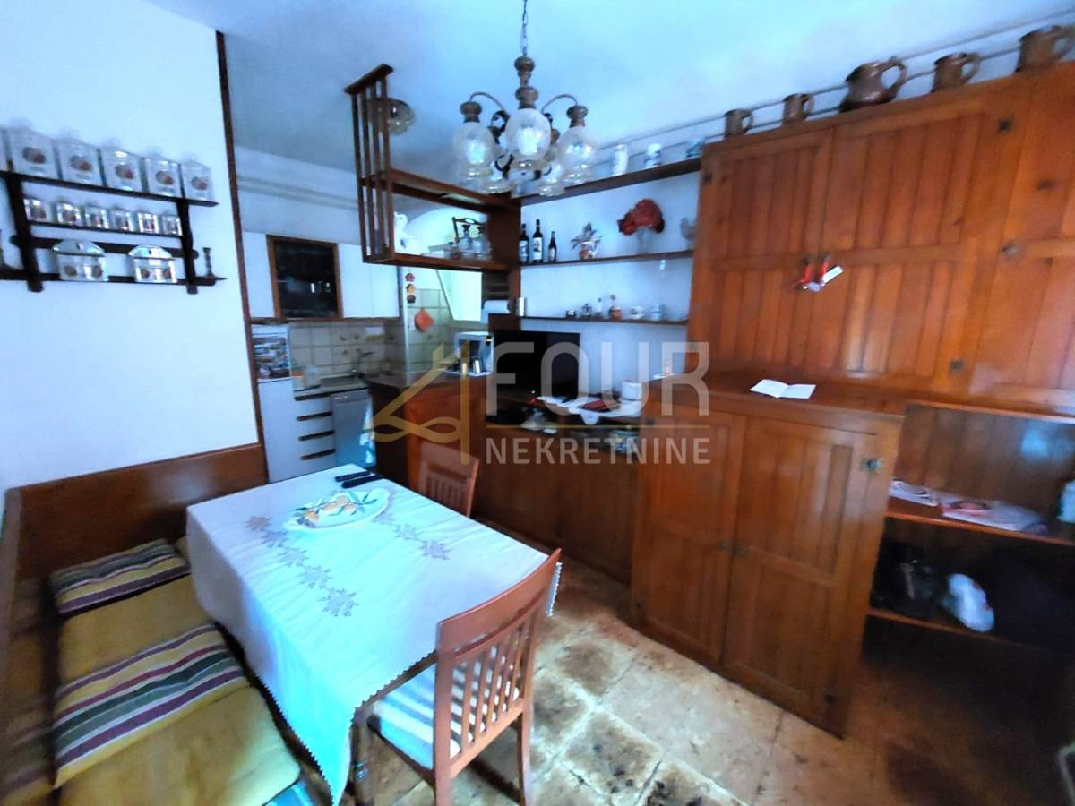 Glavna kuća proteže se kroz prizemlje, dva kata i visoko potkrovlje. U prizemlju se nalazi dnevni boravak s kuhinjom, kupaonica i prostrani hodnik, dok prvi kat nudi četiri sobe te dodatni, odvojeni apartman s posebnim ulazom. Na drugom katu smješten je još jedan apartman te dodatni prostor koji se može urediti prema vlastitim željama, s izlazom na veliku terasu površine 26 m2. Kuća ima i balkon, konobu te spremište, a očuvana drvena stolarija i kameni detalji naglašavaju njezin izvorni karakter.