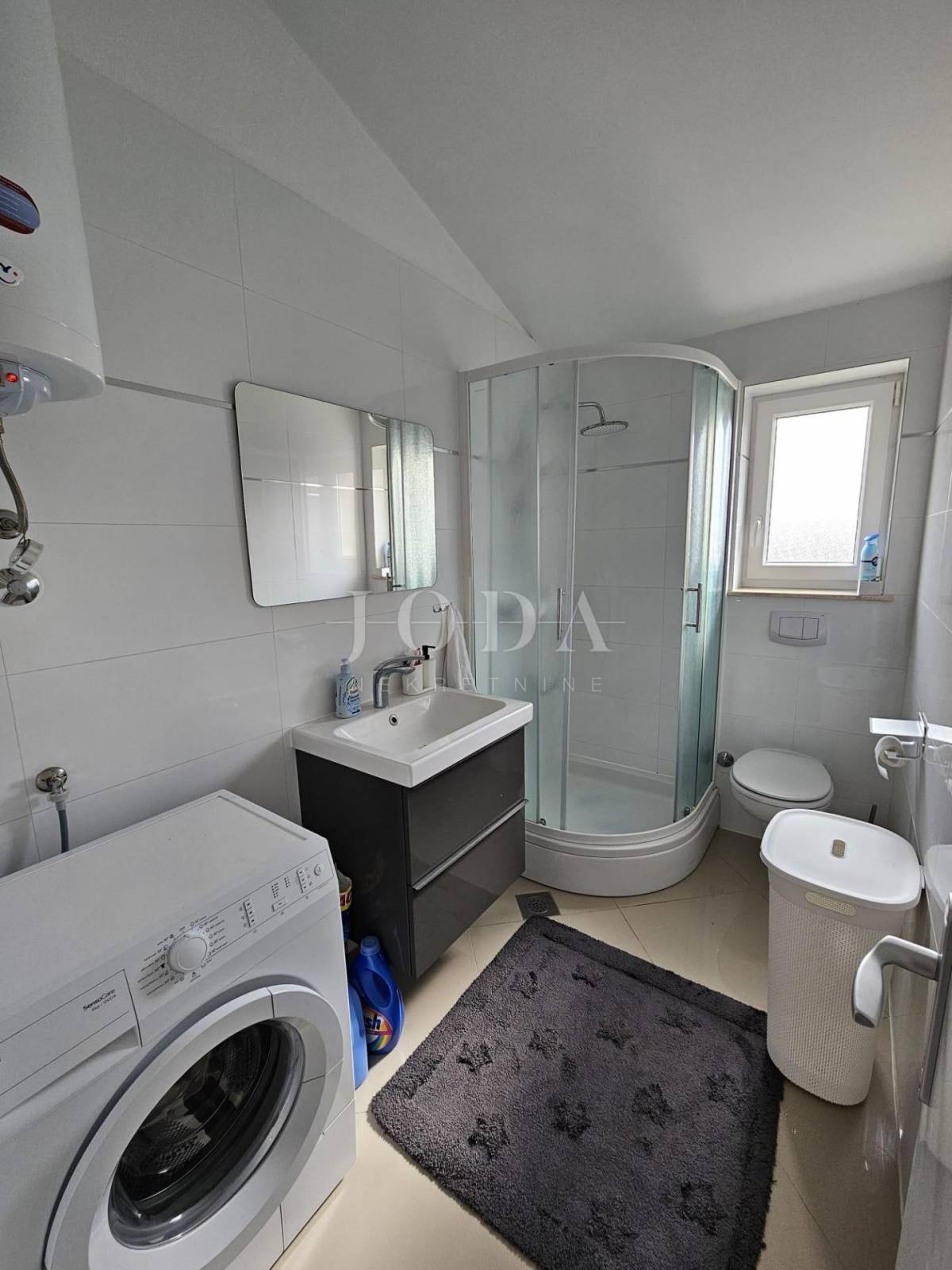 Apartman površine 100 m2 podijeljen je na prvi i drugi kat. Na prvom katu se nalaze prostrani dnevni boravak s izlazom na loggiu s djelomičnim pogledom, kuhinja s blagovaonicom i kupaonica. Na drugom katu se nalazi hodnik, kupaonica i tri spavaće sobe od kojih dvije imaju izlaz na loggiu s koje se pruža otvoren pogled na more. Prizemlje i prvi kat su spojeni unutarnjim stepeništem.