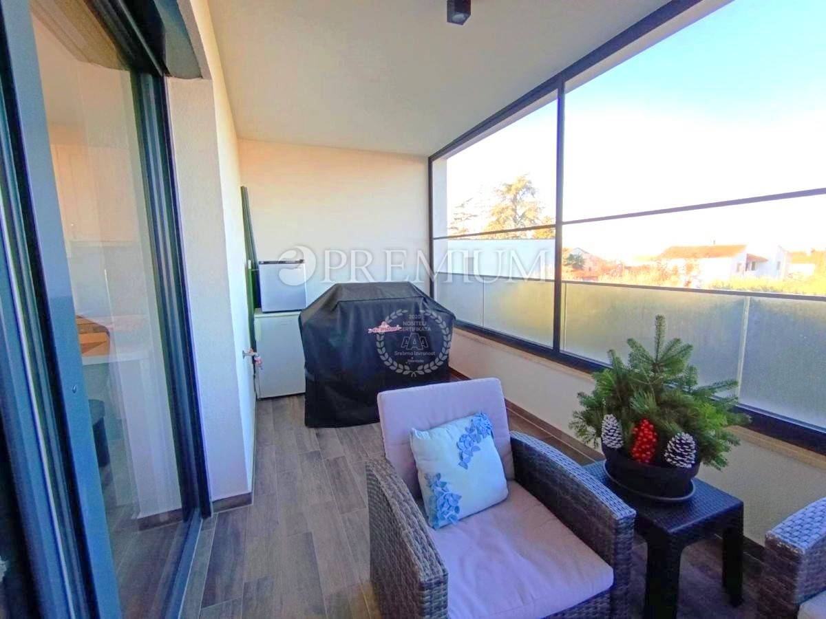 Apartman ukupne neto površine 77 m² sastoji se od ulaznog prostora, dvije spavaće sobe, kupaonice i zasebnog WC-a, spremišta te prostranog dnevnog boravka s kuhinjom i blagovaonom. Iz dnevnog prostora izlazi se na natkrivenu terasu (19 m2) s koje se pruža djelomičan pogled na more.