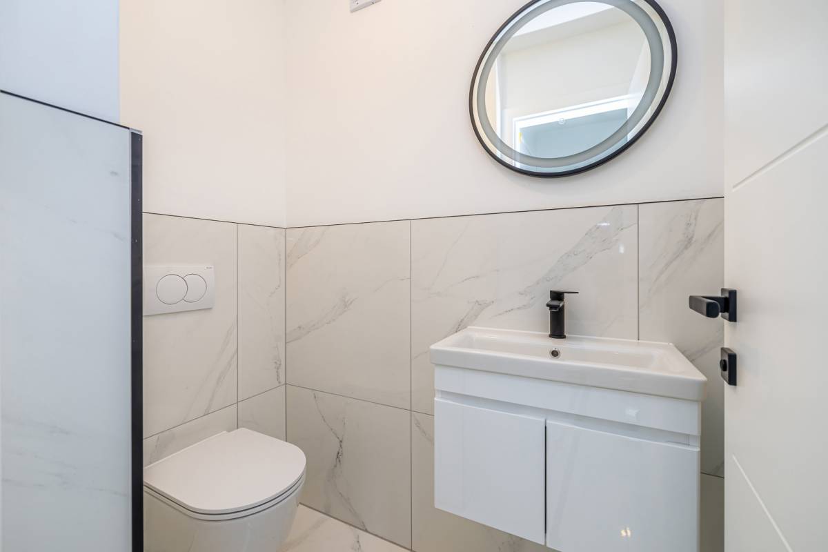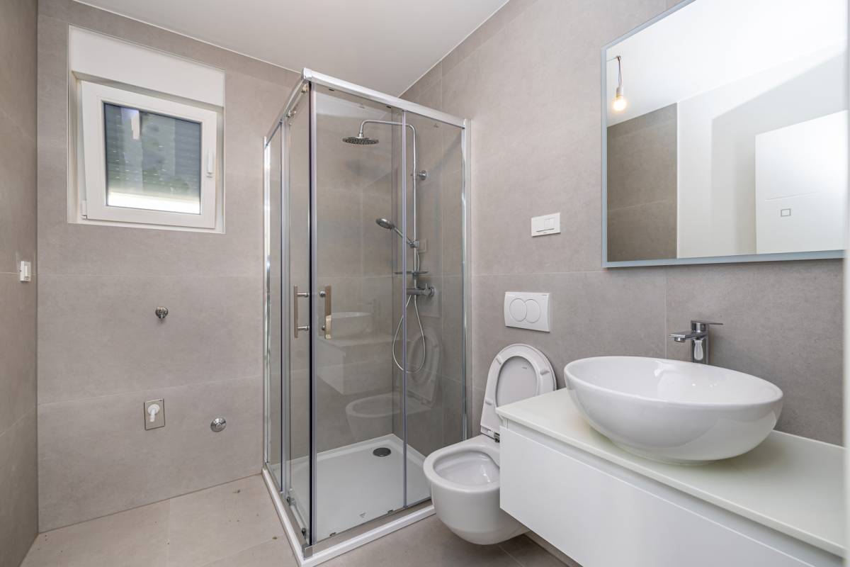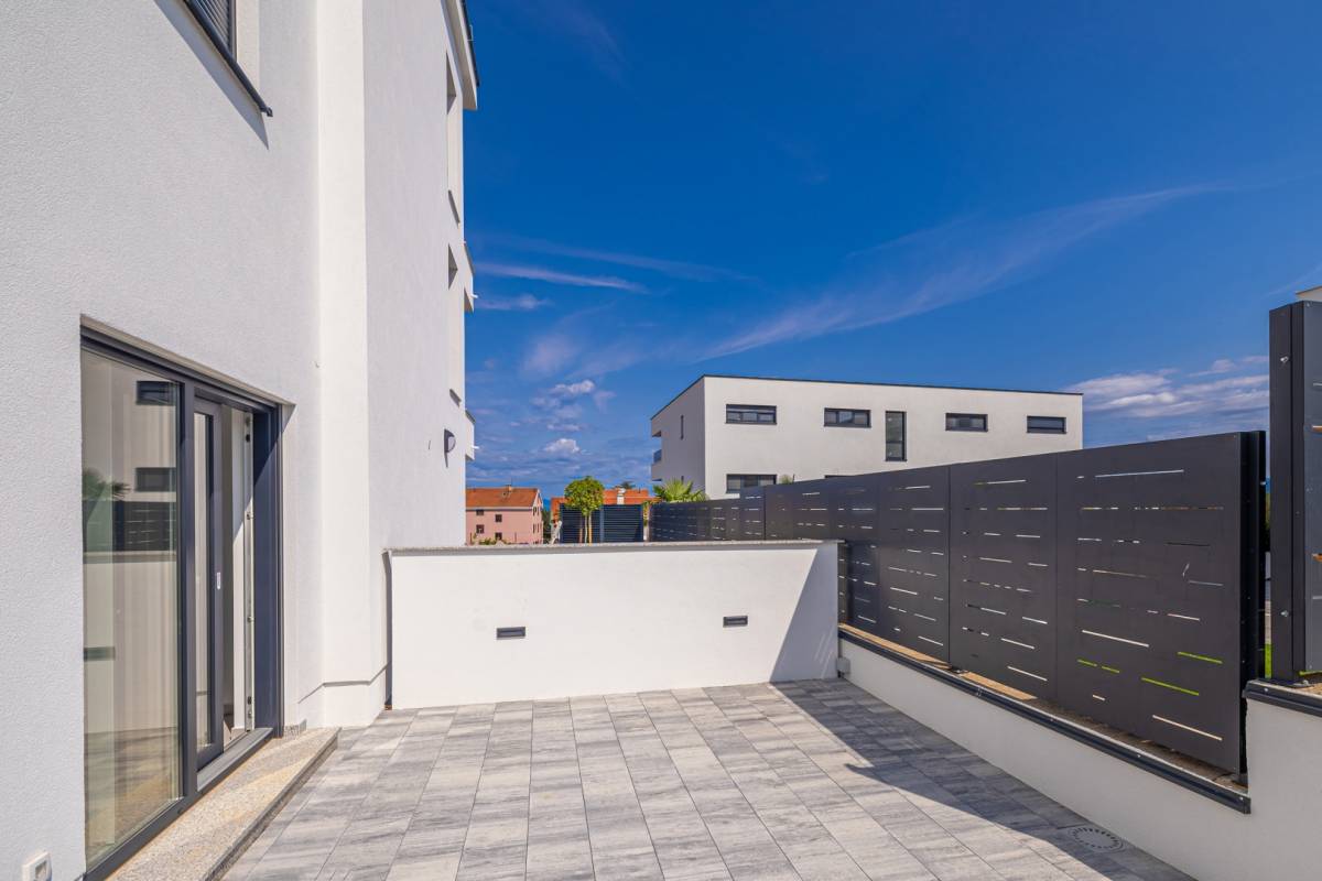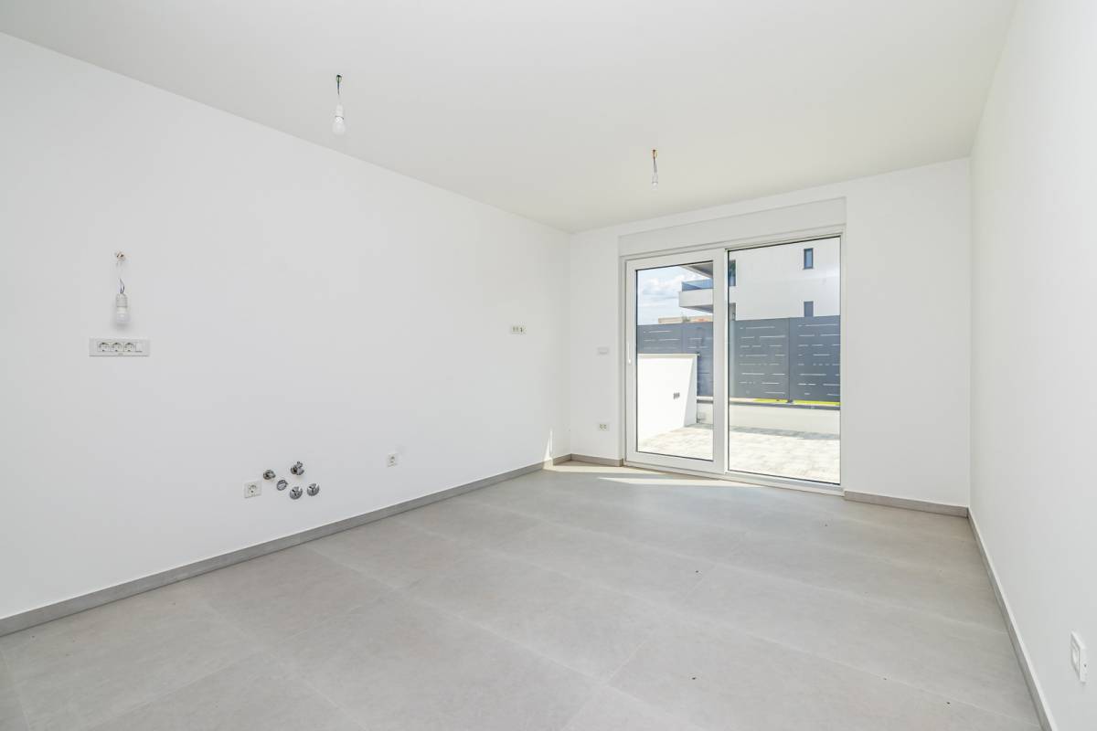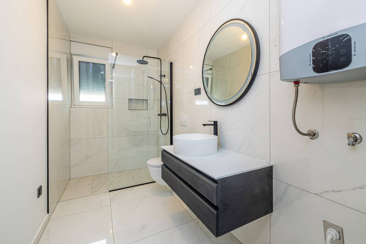 Apartman u prizemlju ima jednu spavaću sobu, moderno uređenu kupaonicu te ugodan dnevni boravak s kuhinjom i blagovaonicom u otvorenom konceptu. Iz dnevnog prostora izlazi se na privatnu, uređenu okućnicu s pripremom za jacuzzi – savršeno mjesto za opuštanje na otvorenom.