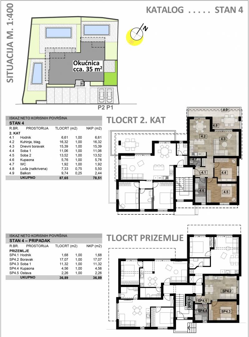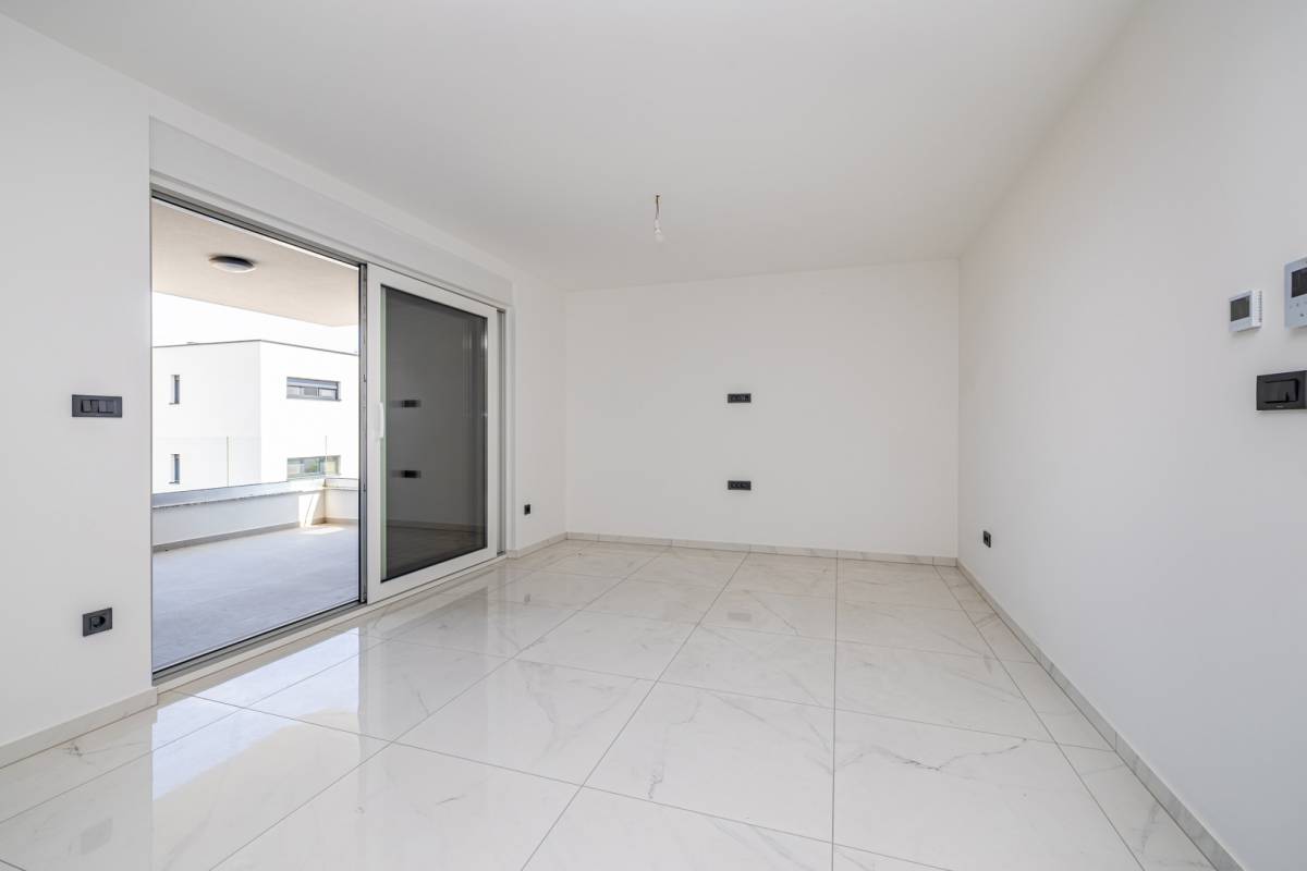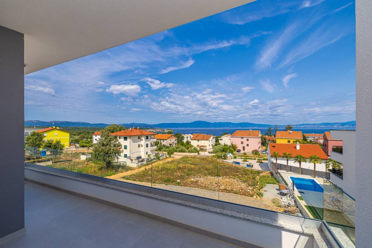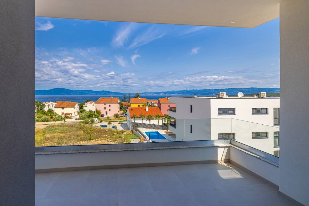 Drugi apartman smješten je na drugom katu i prostire se na prostranom tlocrtu s dvije spavaće sobe, dvije kupaonice, open-space dnevnim boravkom, kuhinjom i blagovaonicom. Posebnu vrijednost daje velika natkrivena terasa s panoramskim pogledom na more – idealna za uživanje u zalascima sunca i mediteranskoj atmosferi. Apartmanu pripadaju i dva parkirna mjesta.