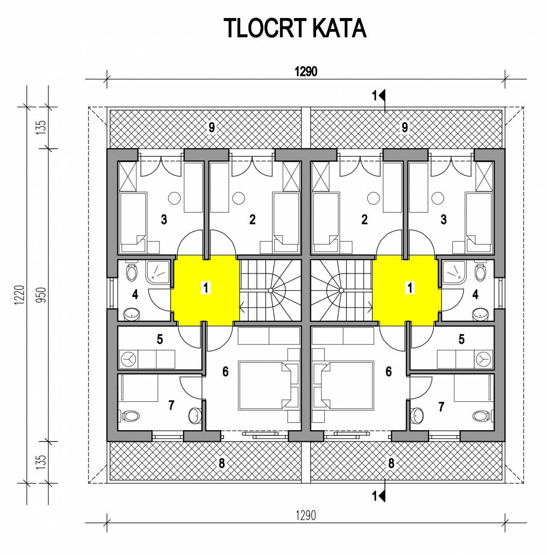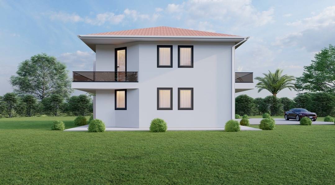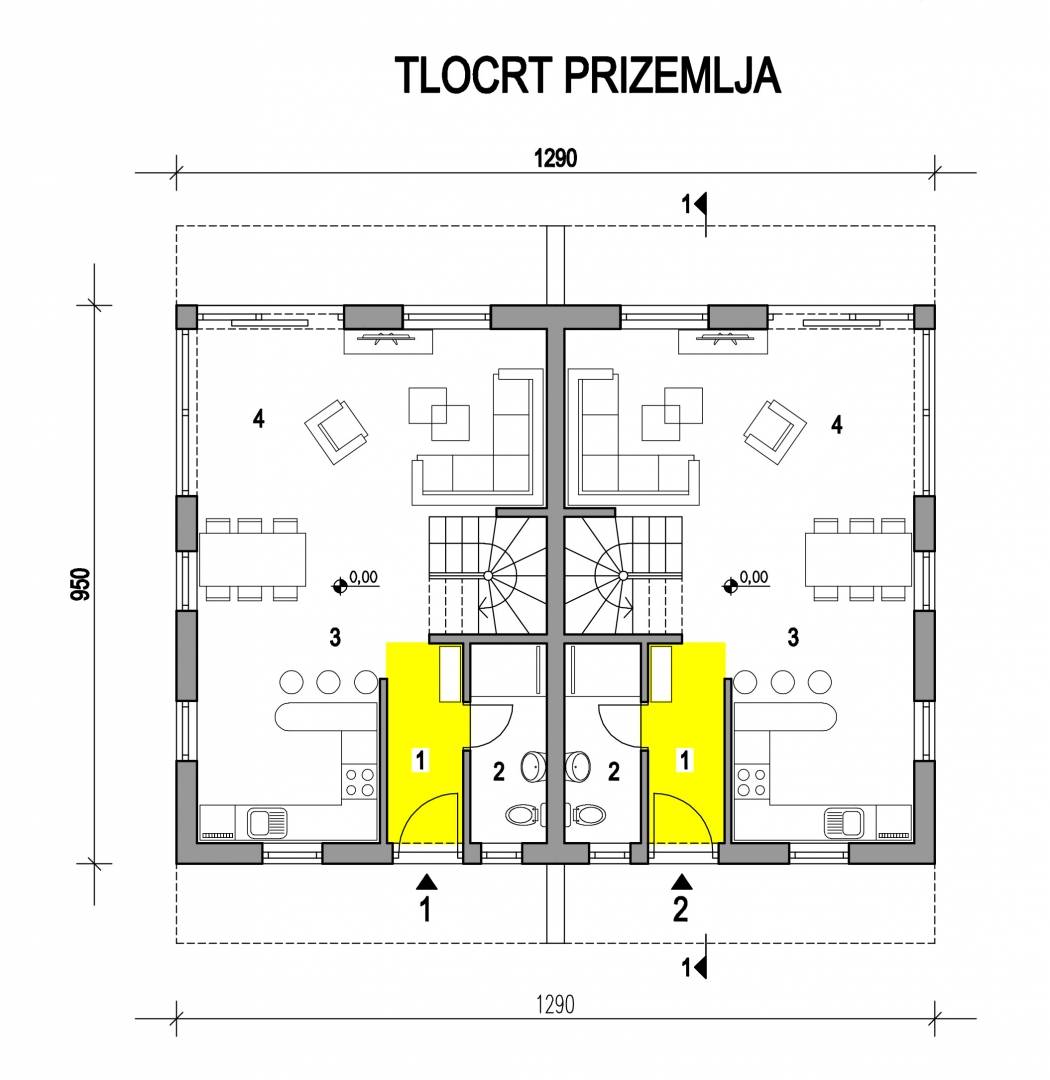U prizemlju se iz hodnika ulazi u kuhinju sa blagovaonicom i dnevnim boravkom otvorenog tipa od kuda se izlazi na natkrivenu terasu. Na donjem se katu nalazi i kupaonica.