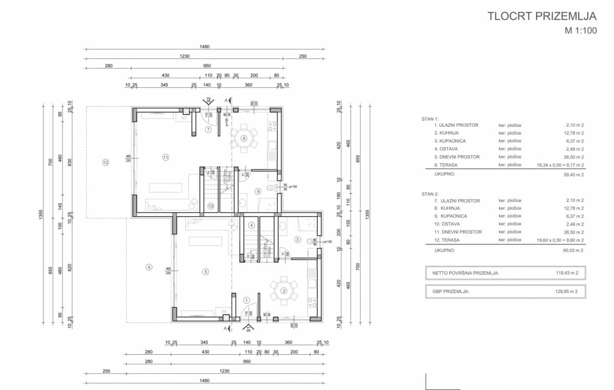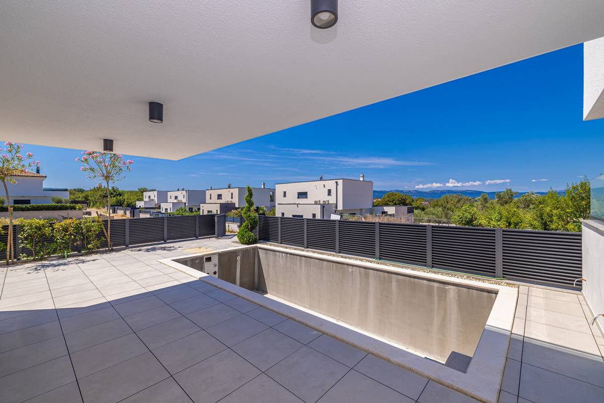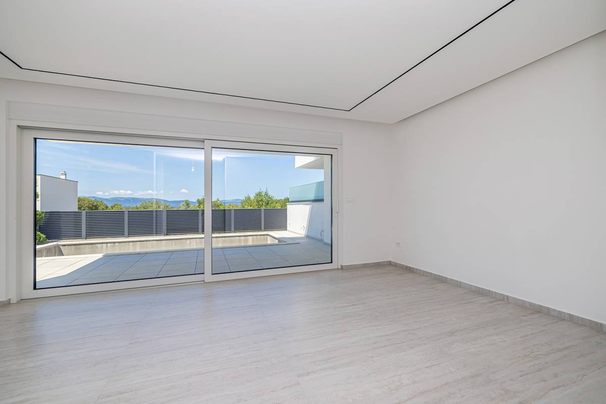Prizemlje kuće oduševljava prostranim dnevnim boravkom koji se prirodno spaja s moderno projektiranom kuhinjom i blagovaonicom, stvarajući skladan i funkcionalan prostor za svakodnevni život. Staklene stijene otvaraju prostor prema velikoj terasi, idealnoj za objedovanje na otvorenom, koja vodi ravno do privatnog bazena i hortikulturno uređenog vrta — savršeno okruženje za opuštanje u privatnosti.