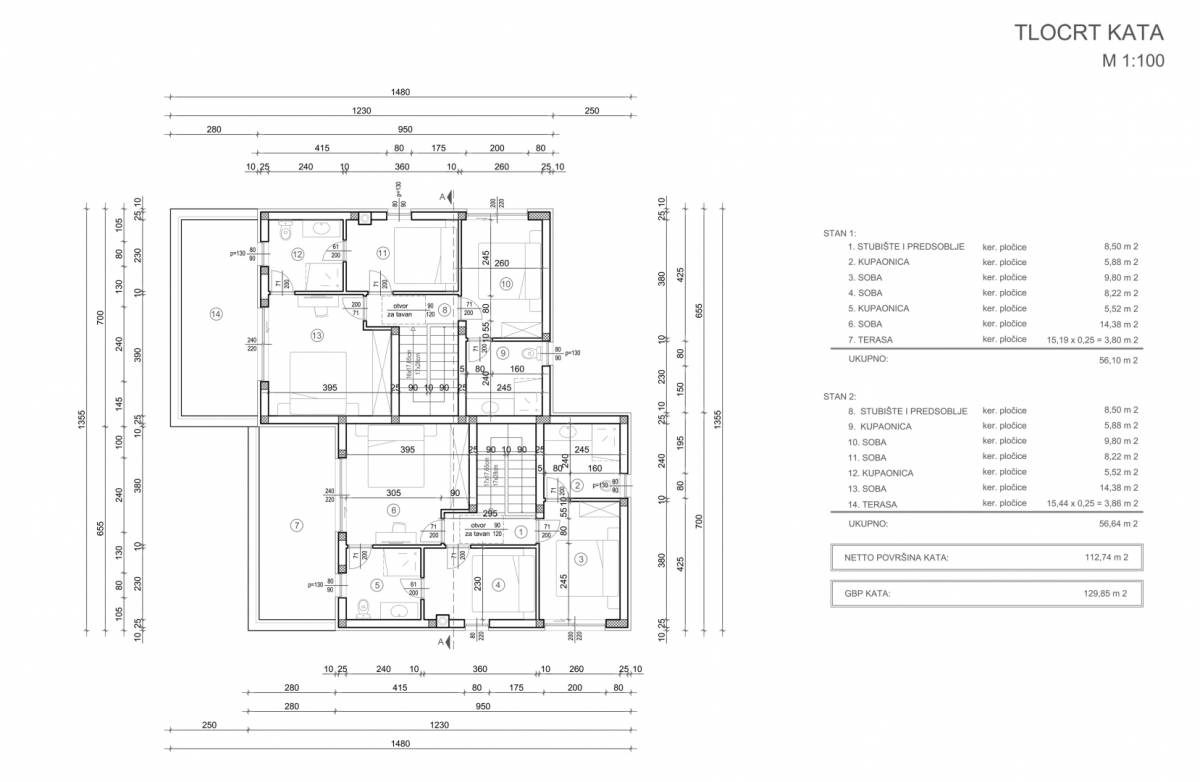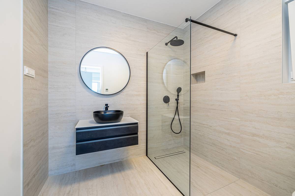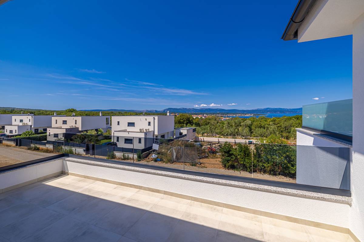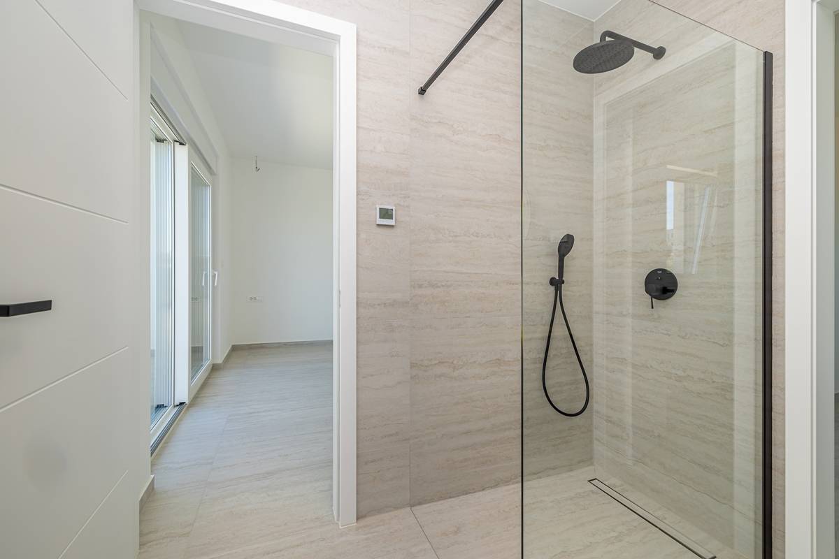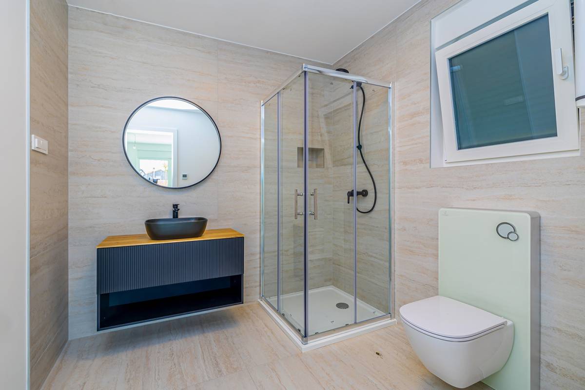 Ispod unutarnjih stepenica nalazi se praktična ostava, dok gornja etaža nudi tri udobne spavaće sobe. Glavna spavaća soba ima vlastitu kupaonicu, a preostale dvije dijele dodatnu kupaonicu. Sve kupaonice opremljene su visokokvalitetnim sanitarijama i elegantnim keramičkim oblogama. S gornje terase pruža se očaravajući pogled na more — savršen za tihe trenutke odmora ili večernje opuštanje.