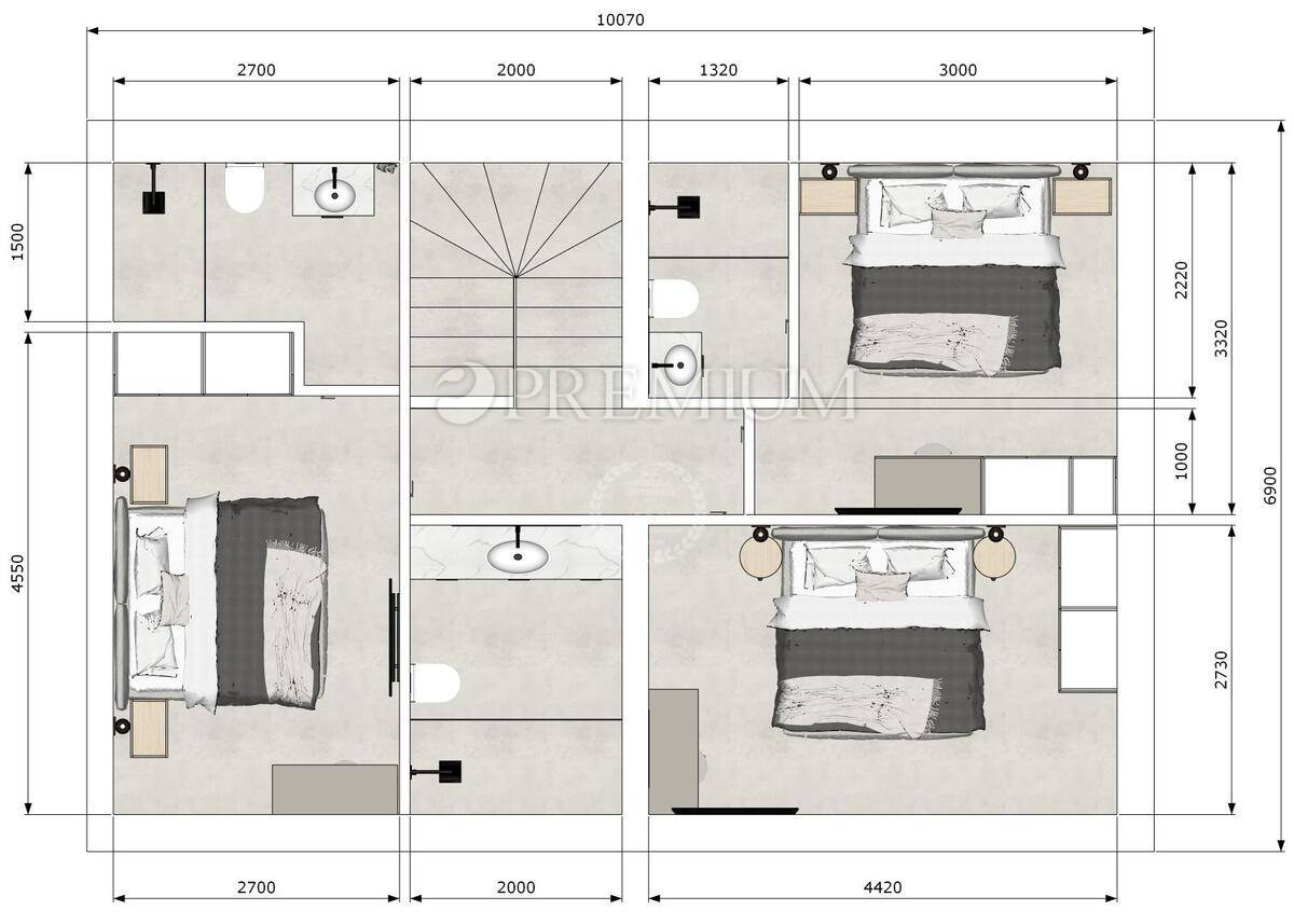 Na katu se nalazi hodnik, tri spavaće sobe, svaka s vlastitom kupaonicom. Dvije spavaće sobe imaju izlaz na terasu s koje se pruža pogled na more.