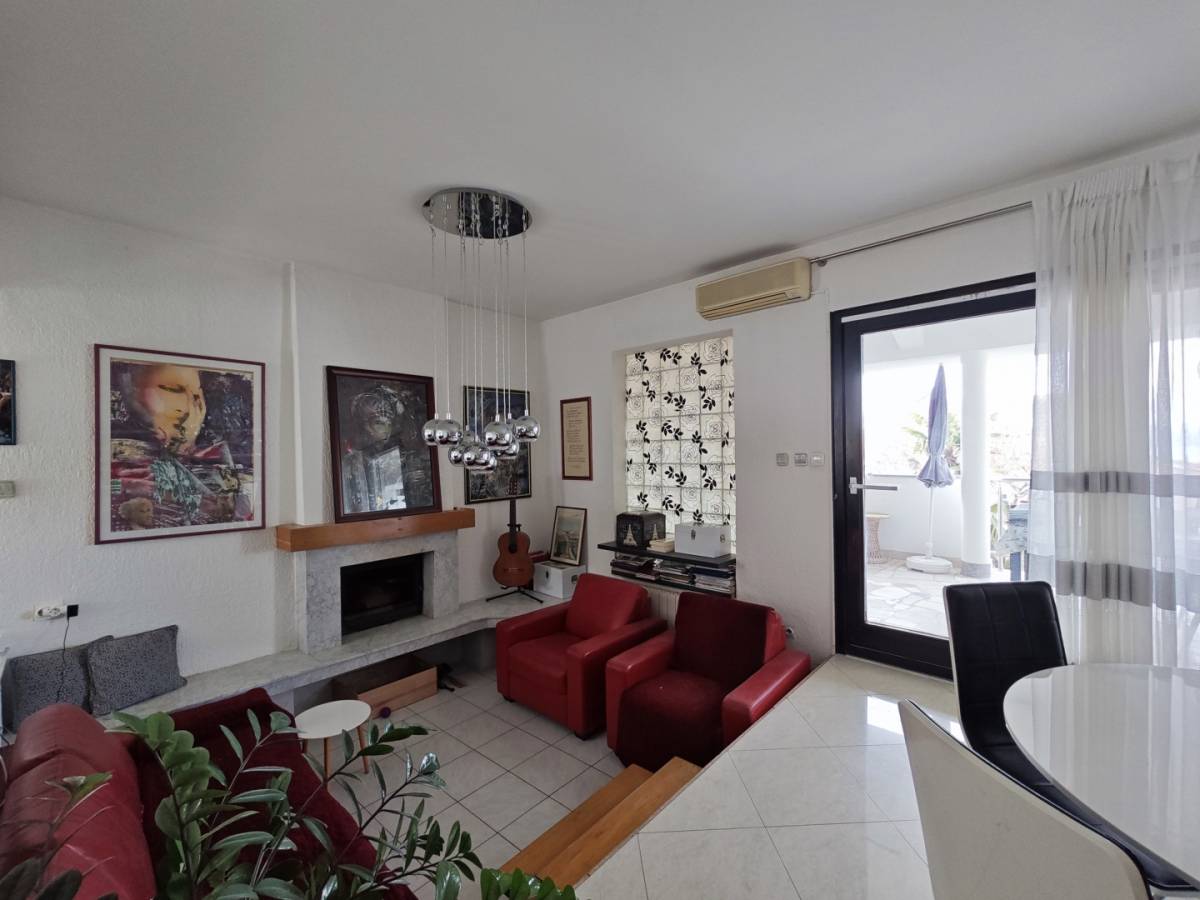 Glavna stambena jedinica prostire se na prvom katu i potkrovlju. Na prvom katu smješteni su moderna kuhinja s blagovaonicom, prostrani dnevni boravak s izlazom na veliku terasu s pogledom na more, spavaća soba, dvije kupaonice i spremište. U potkrovlju se nalaze dodatni dnevni boravak, spavaća soba, kupaonica te kuhinja koja se trenutno koristi kao spremište.