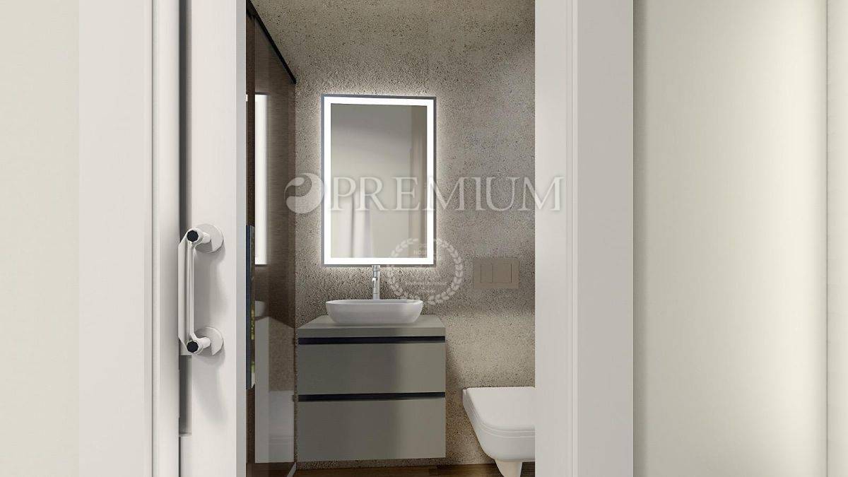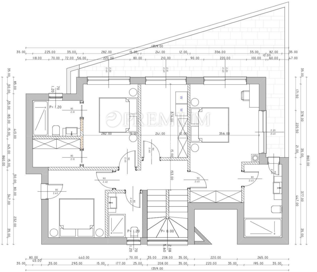 Kat obuhvaća tri spavaće sobe, svaka s vlastitom kupaonicom, čime je osigurana maksimalna udobnost i privatnost. Na katu su smješteni i vešeraj te spremište. Izlaz na natkrivenu terasu pruža lijep otvoren pogled na more, koji dodatno naglašava atraktivnost ove nekretnine i stvara poseban ugođaj za boravak na otvorenom.