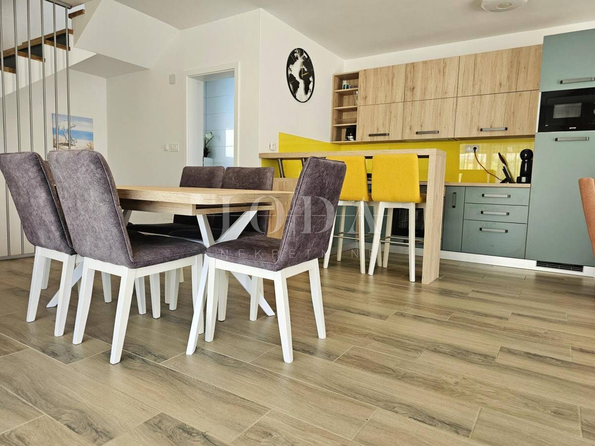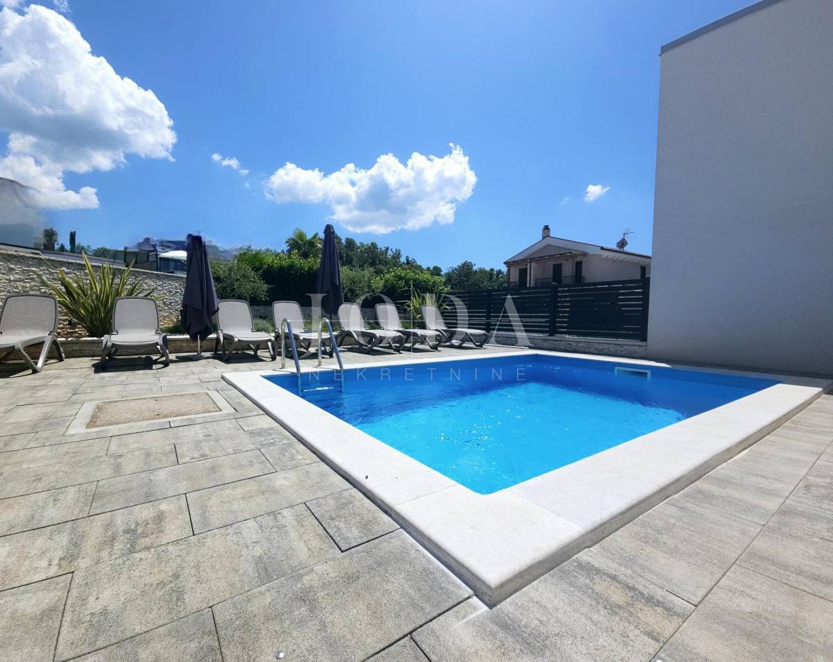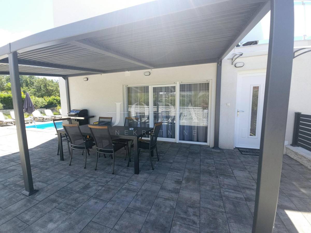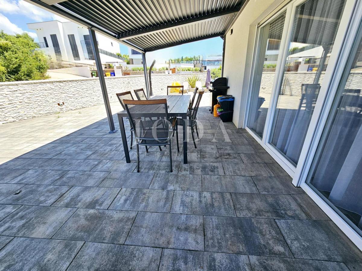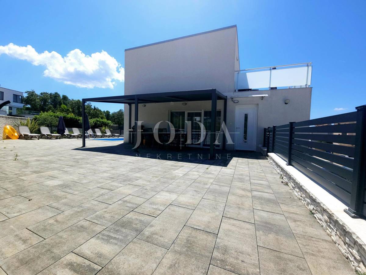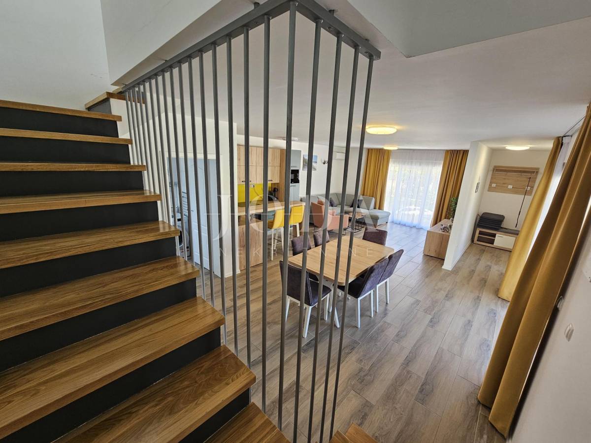 Prodaje se nova dvojna, moderna kuća s grijanim bazenom na mirnoj lokaciji u Malinskoj. Kuća se proteže na tri etaže, suteren, prizemlje i kat, a ima ukupnu površinu 122,64 m2. U suterenu se nalaze dvije spavaće sobe, kupaonica, predsoblje, te spremište ispod stepenica. Prizemlje se sastoji od dnevnog boravka, kuhinje s blagovaonicom, stubišta i toaleta. Iz dnevnog boravka izlazi se na lijepo uređenu okućnicu gdje se nalazi bazen i sunčalište. Na katu se nalaze kupaonica, spavaća soba s izdvojenim dijelom koji može poslužiti kao radna soba, te prostrana terasa. Na raspolaganju je parking za dva vozila.