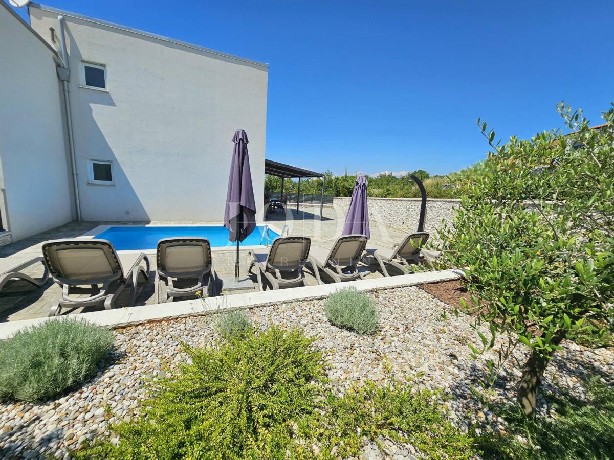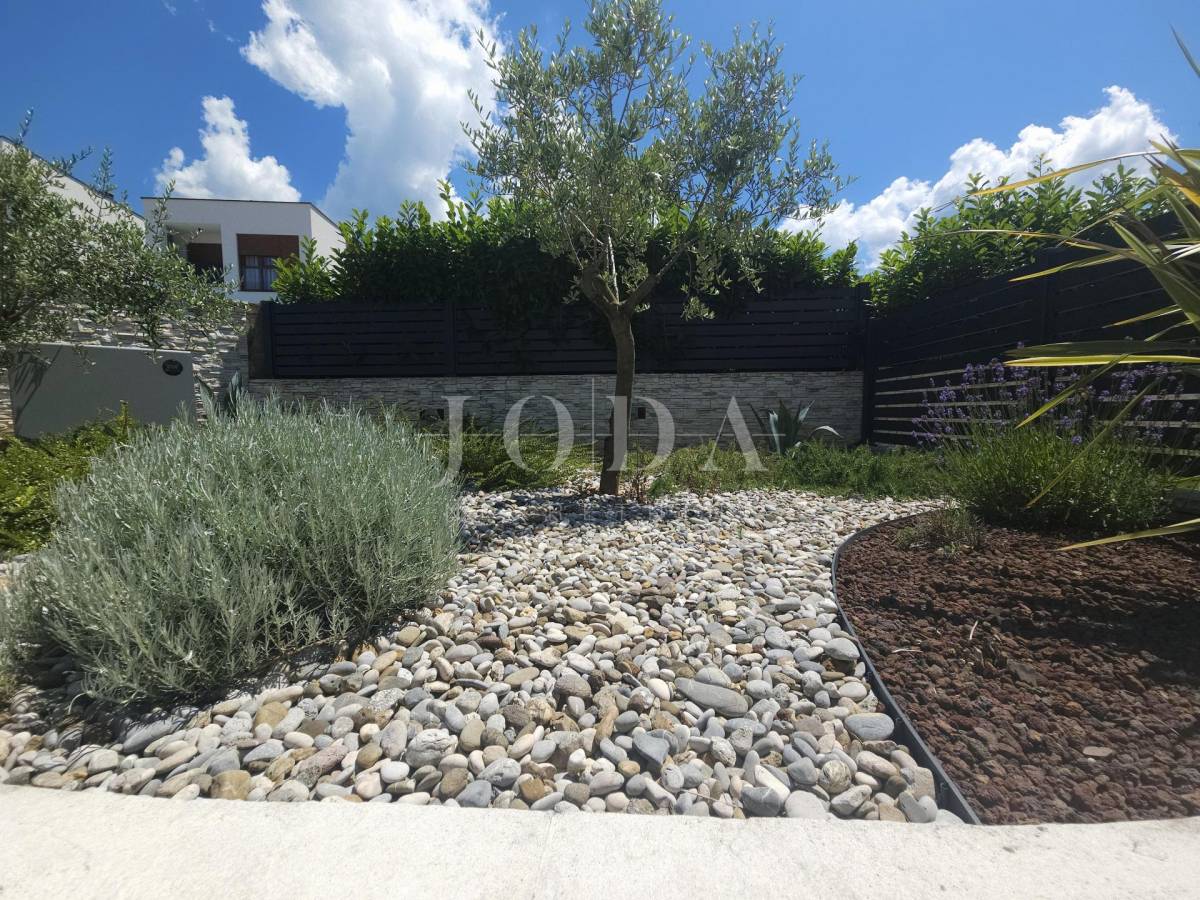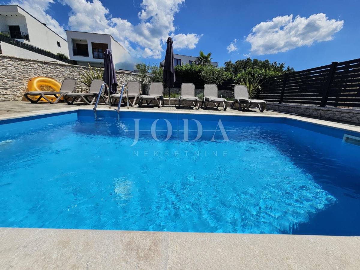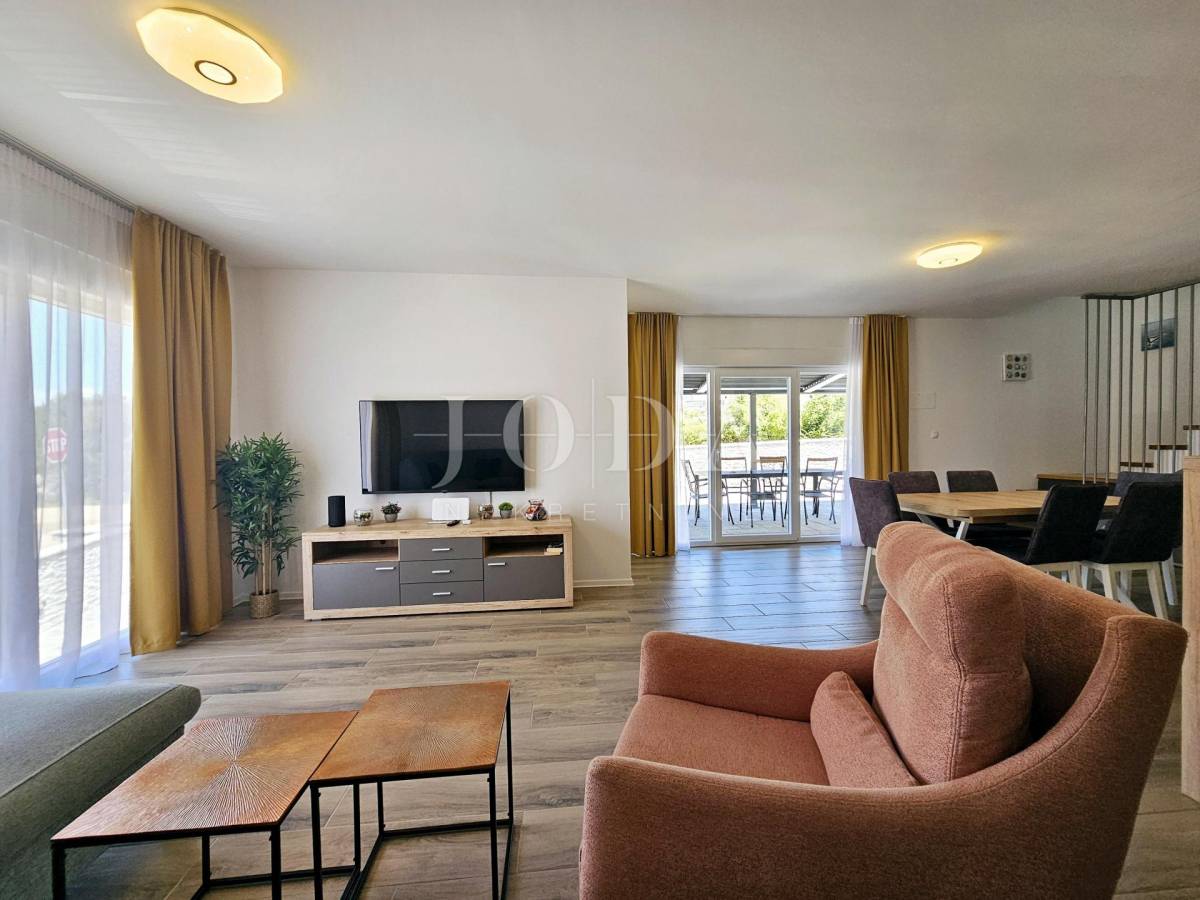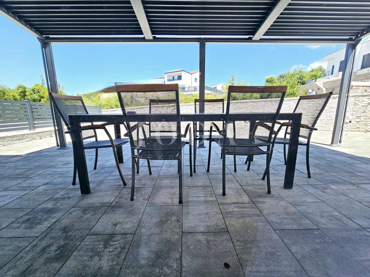 Prodaje se nova dvojna, moderna kuća s grijanim bazenom na mirnoj lokaciji u Malinskoj. Kuća se proteže na tri etaže, suteren, prizemlje i kat, a ima ukupnu površinu 122,64 m2. U suterenu se nalaze dvije spavaće sobe, kupaonica, predsoblje, te spremište ispod stepenica. Prizemlje se sastoji od dnevnog boravka, kuhinje s blagovaonicom, stubišta i toaleta. Iz dnevnog boravka izlazi se na lijepo uređenu okućnicu gdje se nalazi bazen i sunčalište. Na katu se nalaze kupaonica, spavaća soba s izdvojenim dijelom koji može poslužiti kao radna soba, te prostrana terasa. Na raspolaganju je parking za dva vozila.