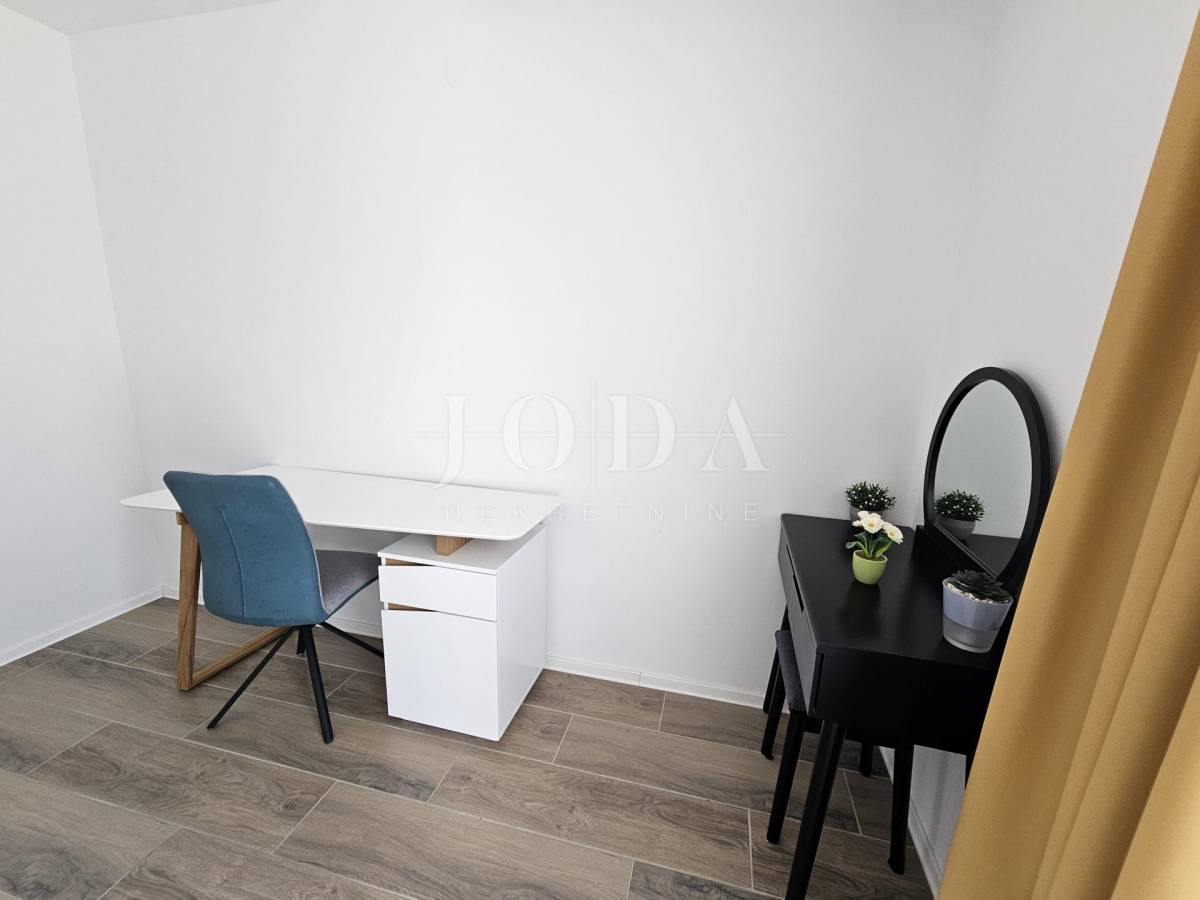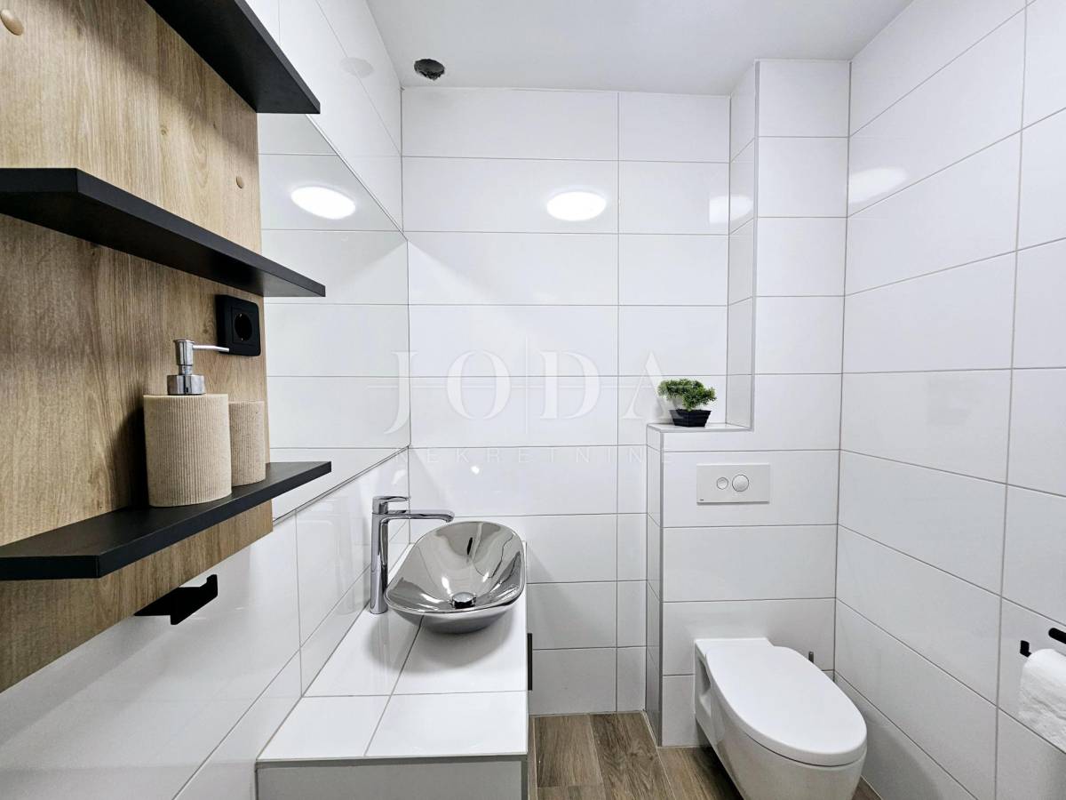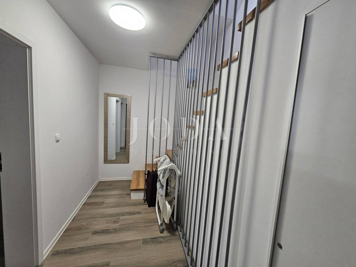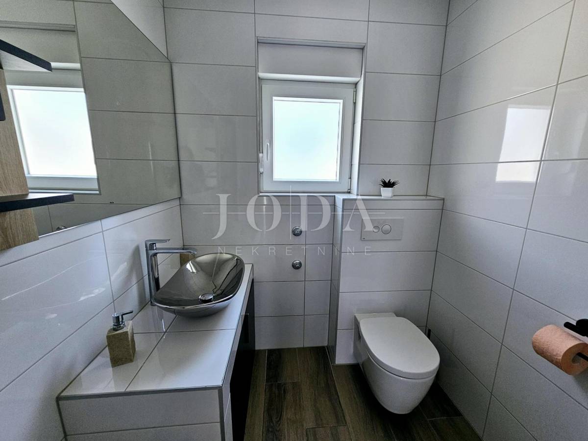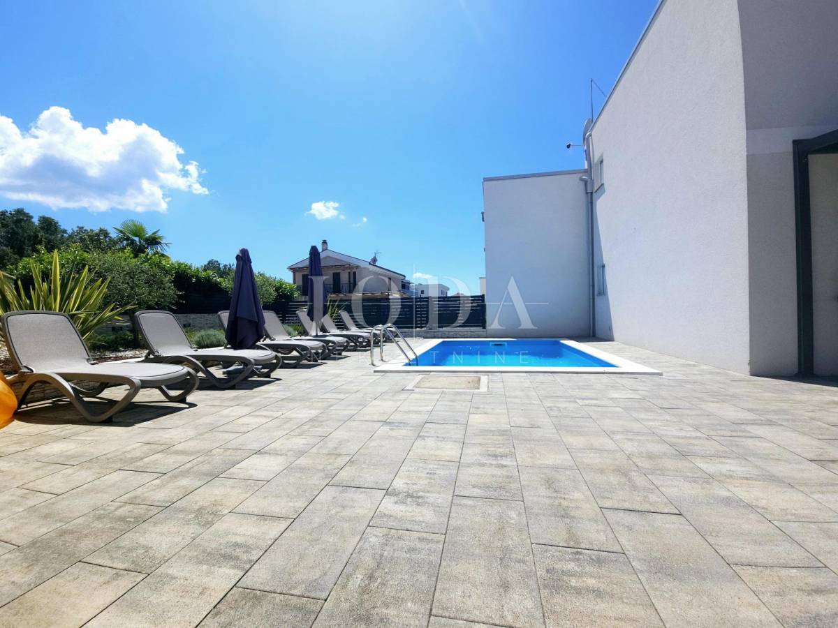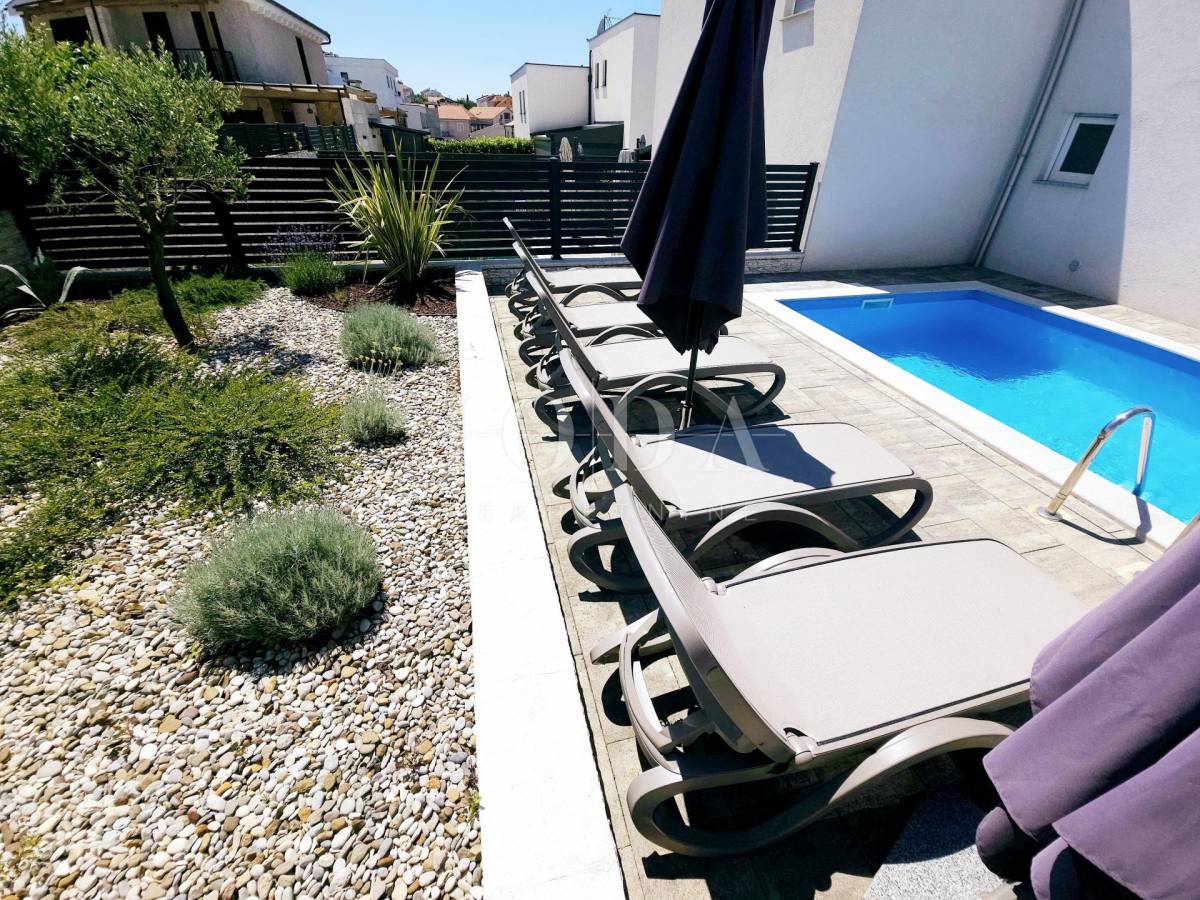Prodaje se nova dvojna, moderna kuća s grijanim bazenom na mirnoj lokaciji u Malinskoj. Kuća se proteže na tri etaže, suteren, prizemlje i kat, a ima ukupnu površinu 122,64 m2. U suterenu se nalaze dvije spavaće sobe, kupaonica, predsoblje, te spremište ispod stepenica. Prizemlje se sastoji od dnevnog boravka, kuhinje s blagovaonicom, stubišta i toaleta. Iz dnevnog boravka izlazi se na lijepo uređenu okućnicu gdje se nalazi bazen i sunčalište. Na katu se nalaze kupaonica, spavaća soba s izdvojenim dijelom koji može poslužiti kao radna soba, te prostrana terasa. Na raspolaganju je parking za dva vozila.