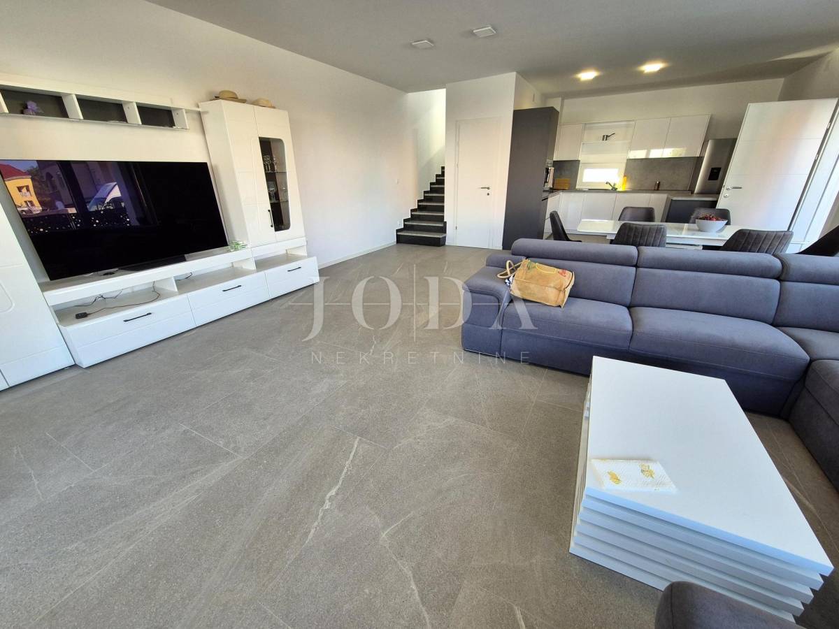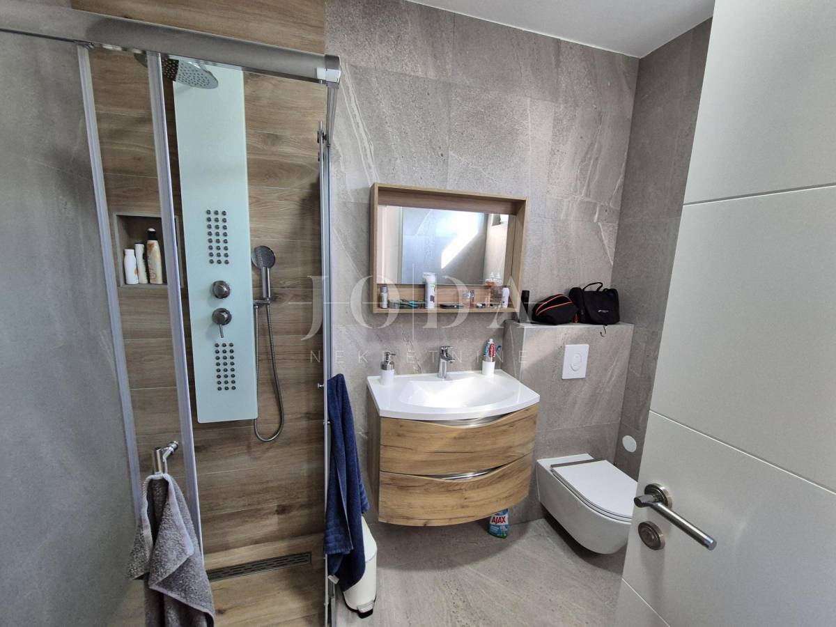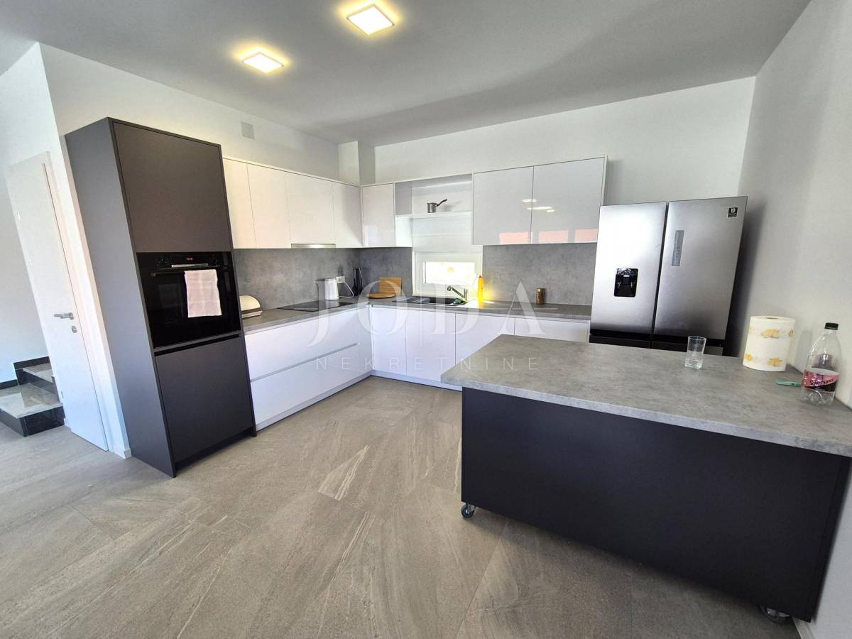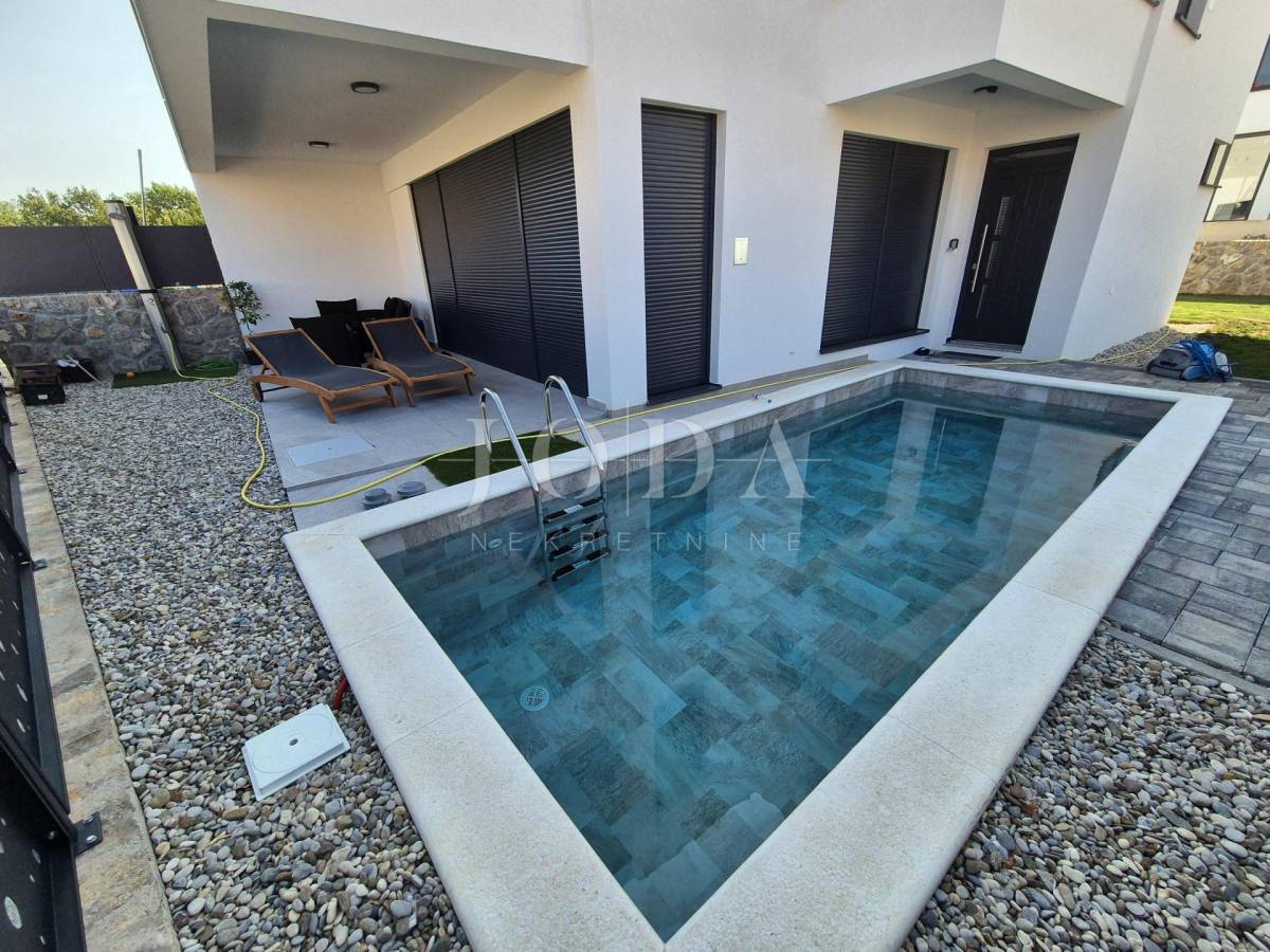 Nekretnina ima površinu 156 m2 a proteže na prizemlje i kat. U prizemlju su predsoblje, garderoba, kupaonica i veliki otvoreni prostor koji objedinjuje dnevni boravak, kuhinju i blagovaonicu te natkrivena terasa površine 15 m2. Na katu se nalaze hodnik, garderoba, tri spavaće sobe, svaka sa svojom kupaonicom i dva balkona. Kuća se prodaje po sistemu ključ u ruke, s uređenom okućnicom s bazenom i dva parkirna mjesta. Kvalitetna gradnja s podnim grijanjem po sistemu toplinske pumpe, PVC stolarija s roletama, klimatizacija svih prostorija. Useljivo odmah!