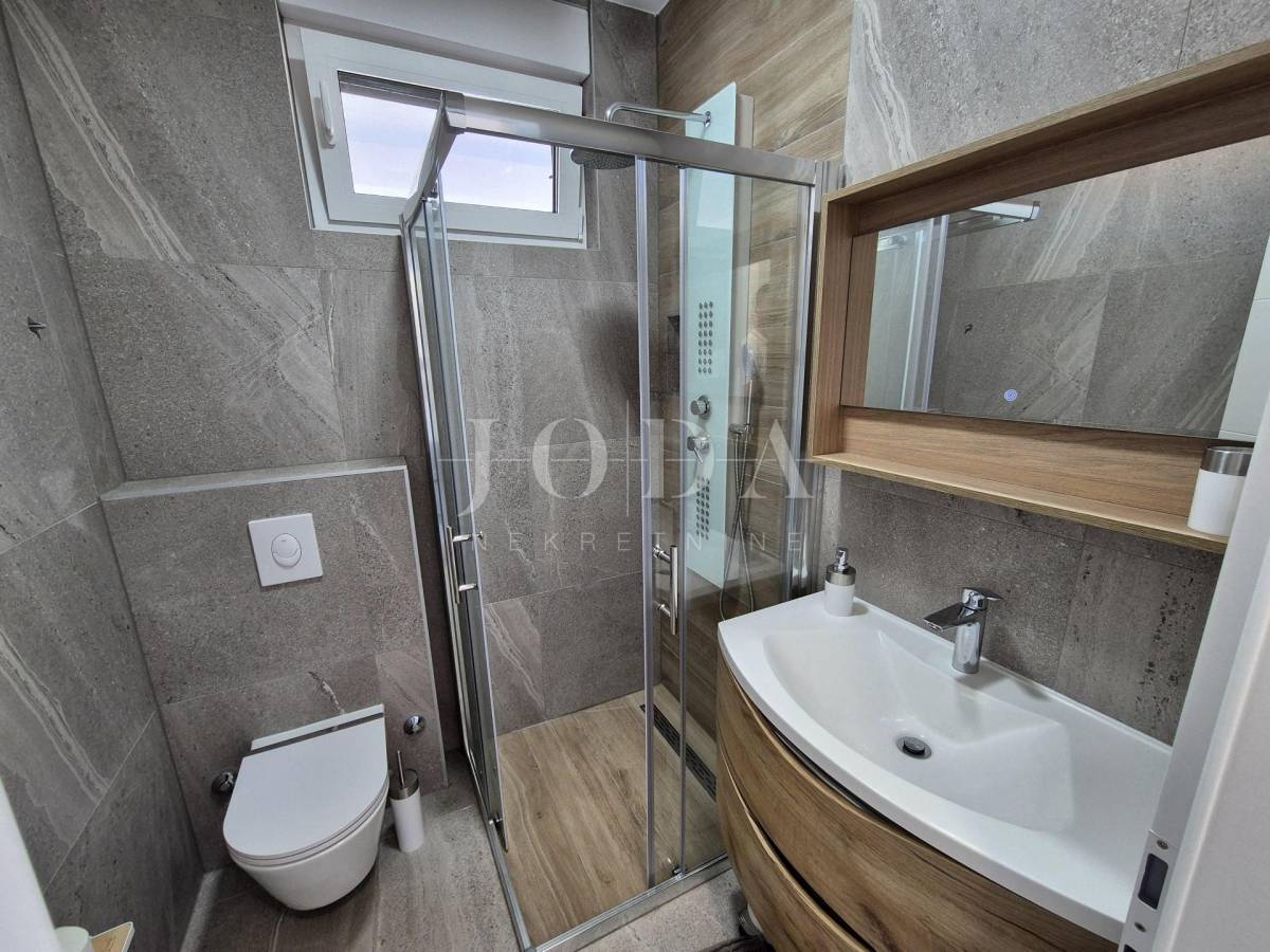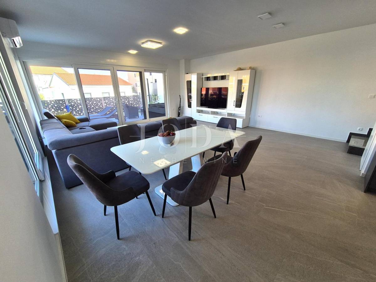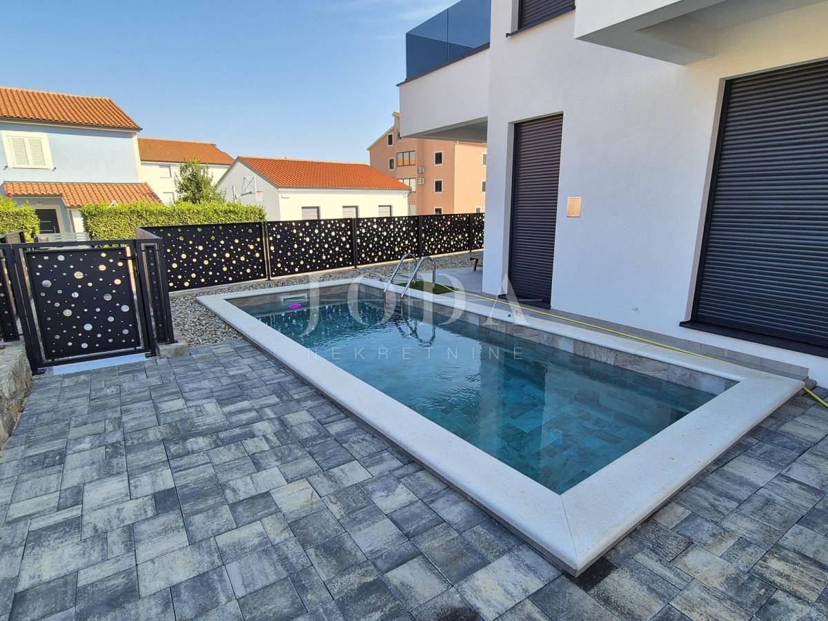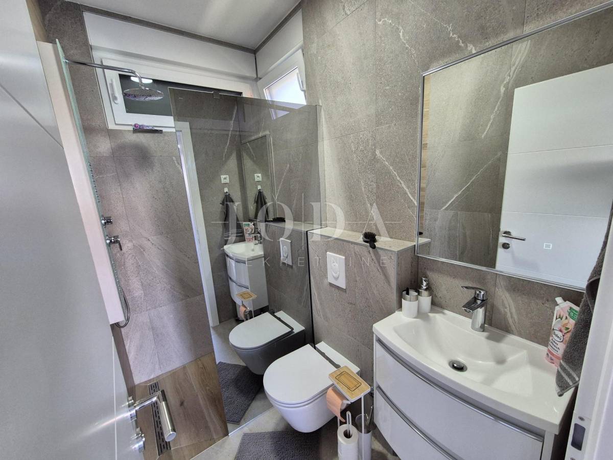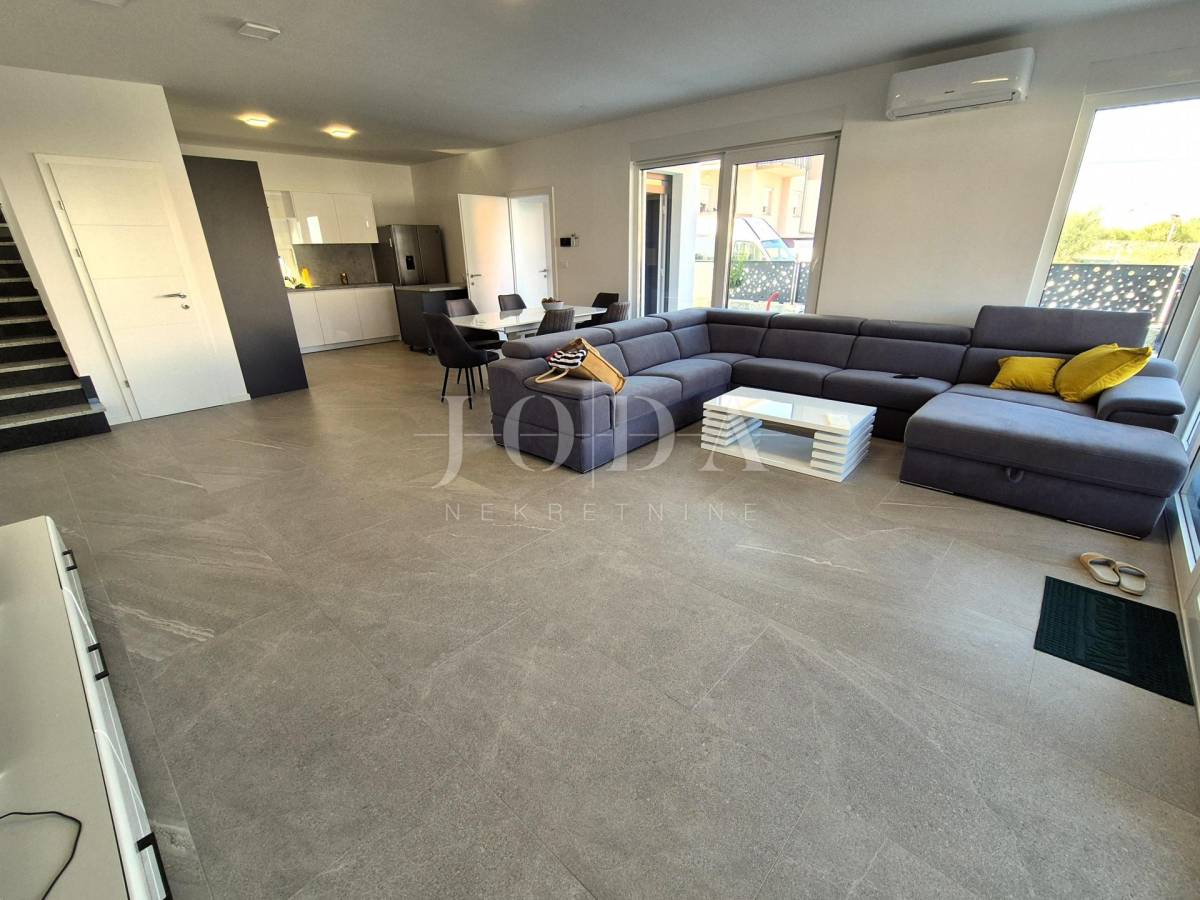 Nekretnina ima površinu 156 m2 a proteže na prizemlje i kat. U prizemlju su predsoblje, garderoba, kupaonica i veliki otvoreni prostor koji objedinjuje dnevni boravak, kuhinju i blagovaonicu te natkrivena terasa površine 15 m2. Na katu se nalaze hodnik, garderoba, tri spavaće sobe, svaka sa svojom kupaonicom i dva balkona. Kuća se prodaje po sistemu ključ u ruke, s uređenom okućnicom s bazenom i dva parkirna mjesta. Kvalitetna gradnja s podnim grijanjem po sistemu toplinske pumpe, PVC stolarija s roletama, klimatizacija svih prostorija. Useljivo odmah!