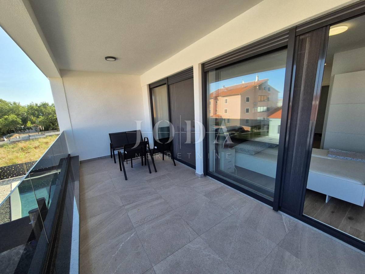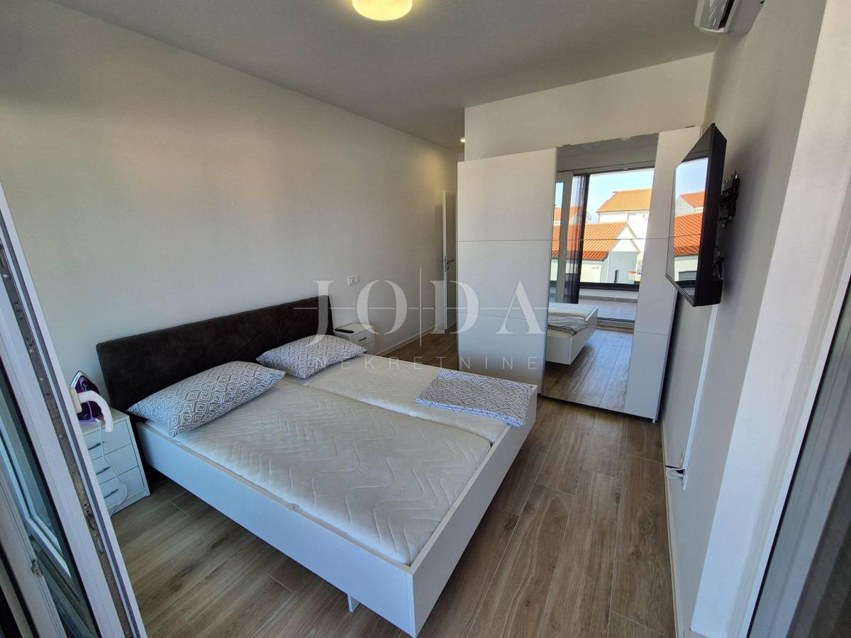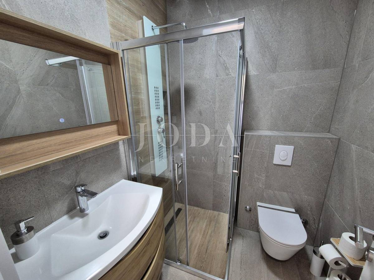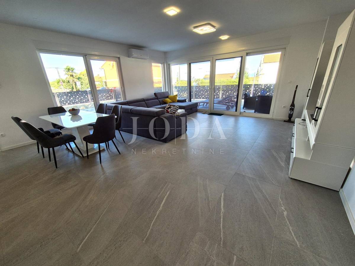 Nekretnina ima površinu 156 m2 a proteže na prizemlje i kat. U prizemlju su predsoblje, garderoba, kupaonica i veliki otvoreni prostor koji objedinjuje dnevni boravak, kuhinju i blagovaonicu te natkrivena terasa površine 15 m2. Na katu se nalaze hodnik, garderoba, tri spavaće sobe, svaka sa svojom kupaonicom i dva balkona. Kuća se prodaje po sistemu ključ u ruke, s uređenom okućnicom s bazenom i dva parkirna mjesta. Kvalitetna gradnja s podnim grijanjem po sistemu toplinske pumpe, PVC stolarija s roletama, klimatizacija svih prostorija. Useljivo odmah!
