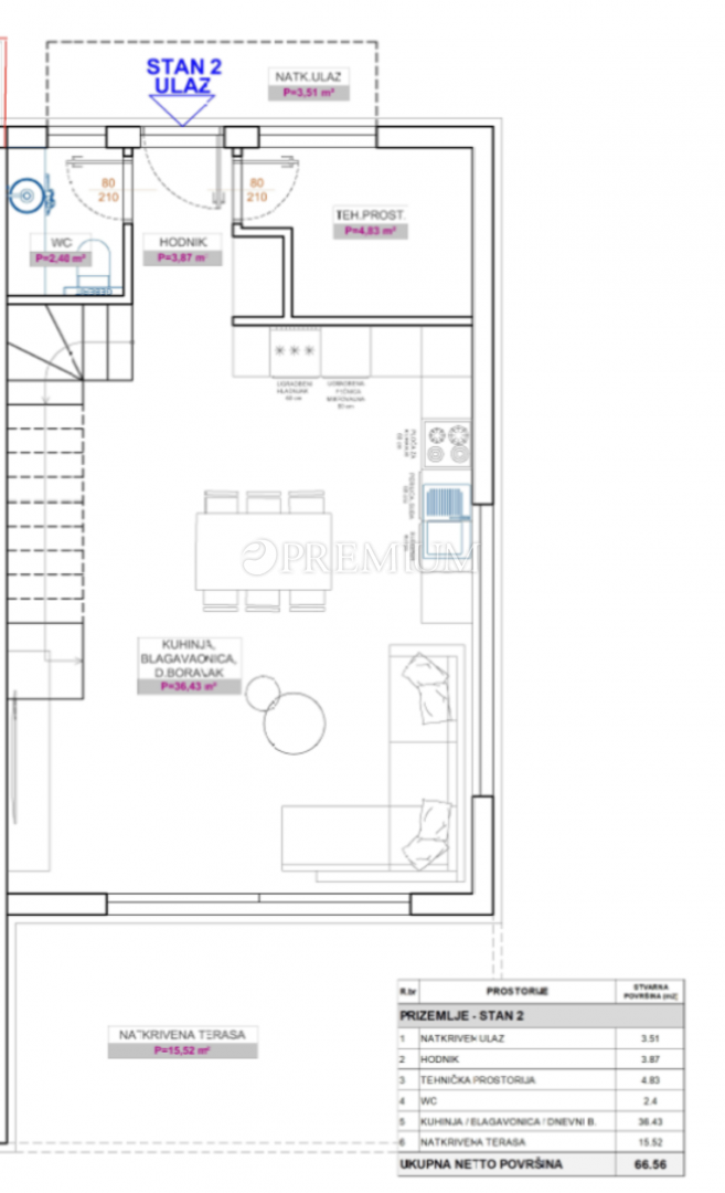 U prizemlju se nalazi prostrani dnevni boravak, moderna kuhinja, blagovaonica, tehnička soba i gostinjski WC. Iz dnevnog boravka izlazi se na natkrivenu terasu i okućnicu.