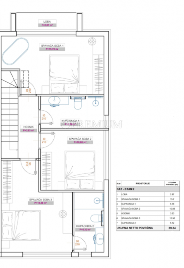 Na katu se nalazi hodnik, tri spavaće sobe i dvije kupaonice. Master soba ima vlastitu kupaonicu.