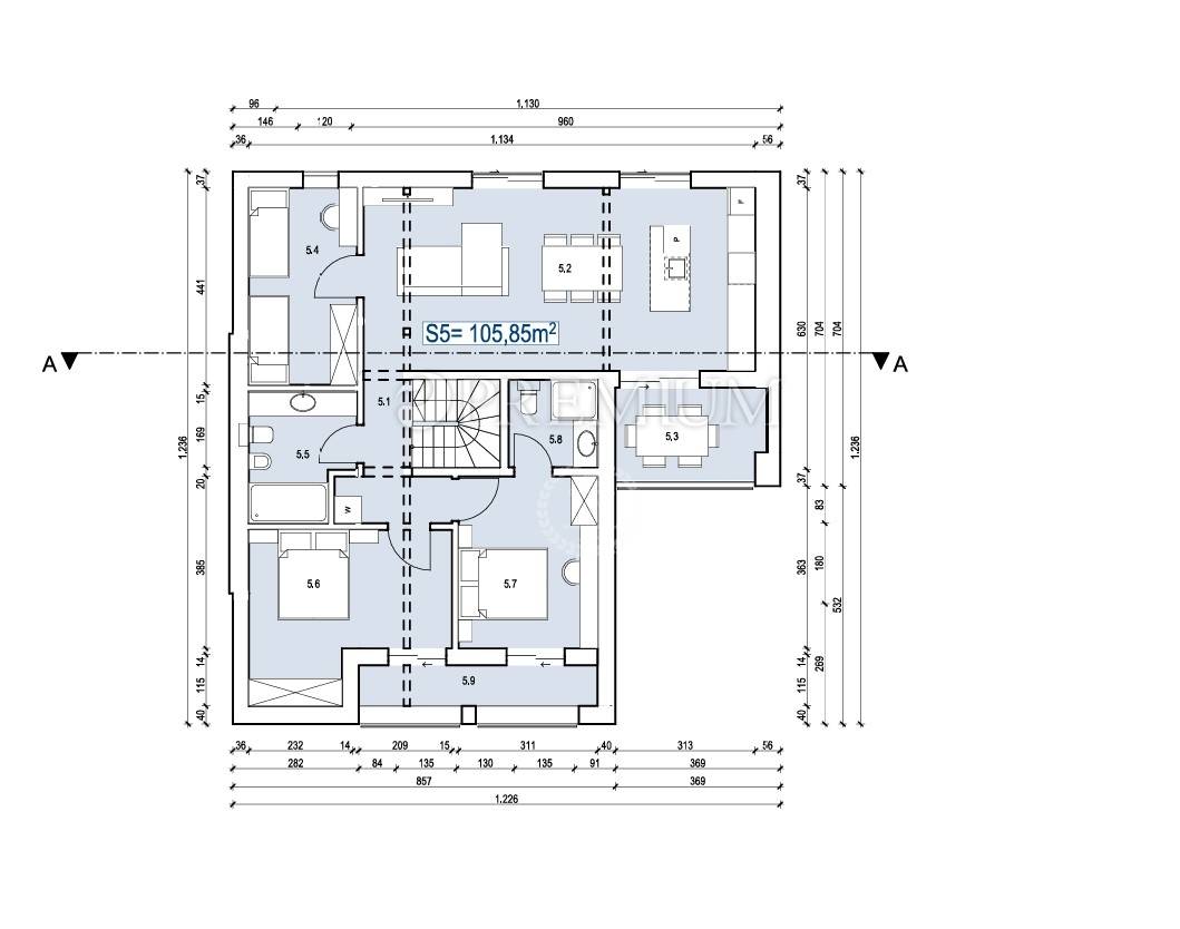 Apartman ukupne površine 106 m² smješten je na drugom katu objekta s ukupno pet stambenih jedinica te zauzima cijelu etažu, što osigurava dodatnu privatnost i komfor.