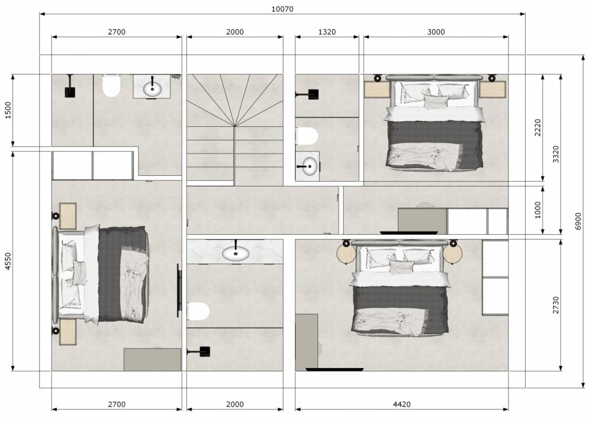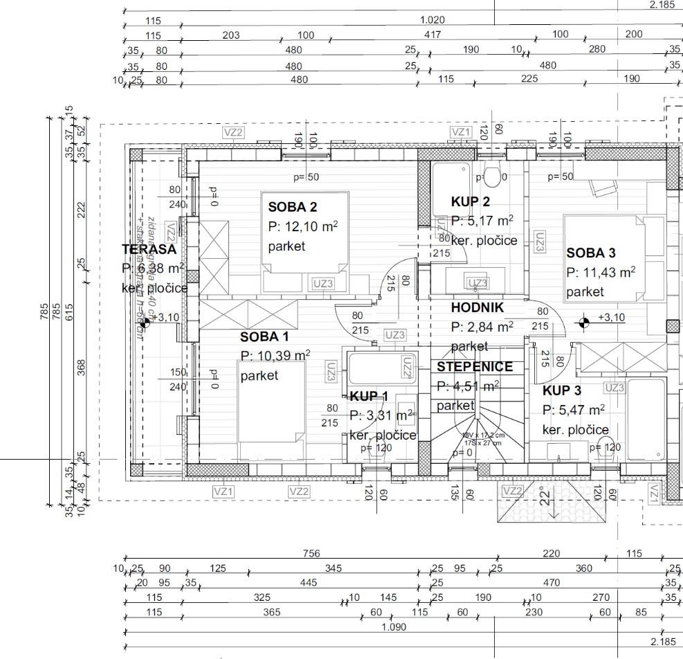Na katu su tri spavaće sobe, svaka s vlastitom kupaonicom. Sobe su međusobno slične po veličini, bez velike razlike. Nema dijeljenja ni čekanja. S terase na katu vidi se more i zelenilo, orijentacija jugozapad.