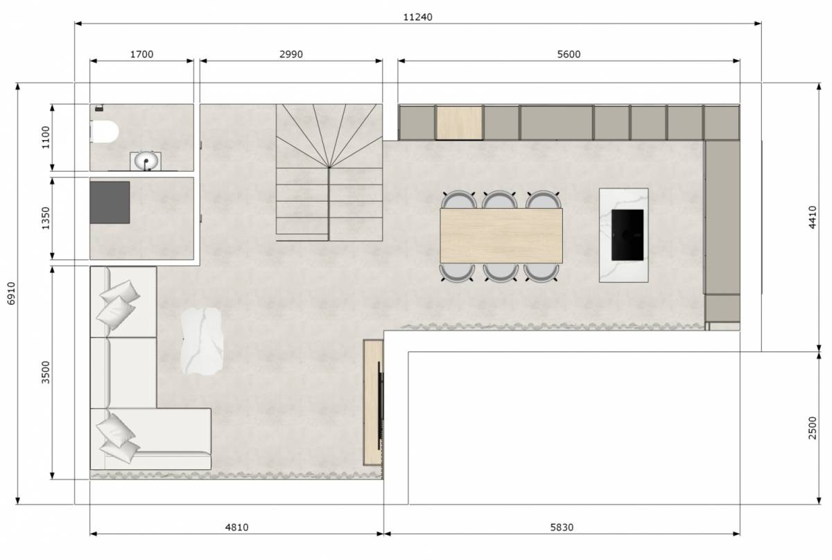 Prizemlje je jedan otvoreni prostor, dnevni boravak, blagovaonica i kuhinja bez pregrada. Iz tog prostora izlazi se na natkrivenu terasu koja je glavna točka korištenja kuće veći dio godine. Prizemlje ima i WC, ostavu i praonicu. Zvuk se slobodno prenosi kroz cijelo prizemlje, što treba uzeti u obzir kod istovremenog korištenja više zona.