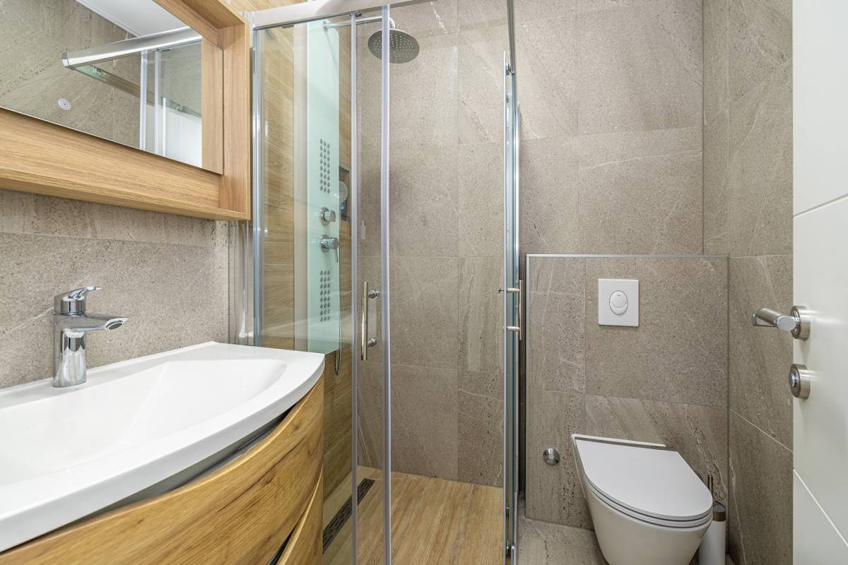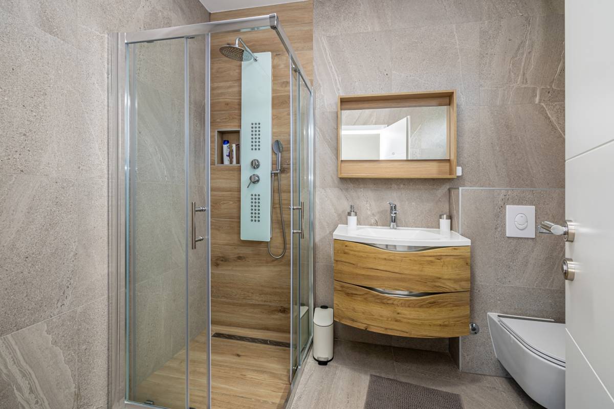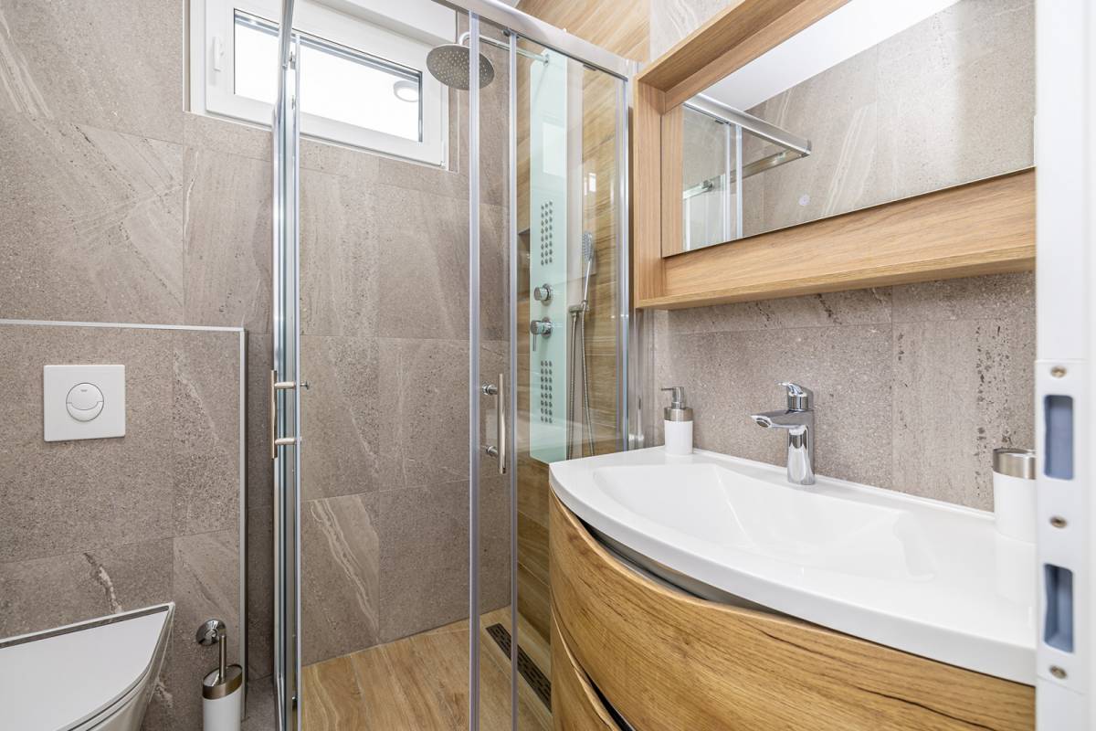 U prizemlju se nalazi prostrani dnevni boravak s kuhinjom i blagovaonicom, iz kojeg se izlazi na natkrivenu terasu i sunčalište uz bazen – savršeno mjesto za opuštanje tijekom toplih ljetnih dana. Tu je i moderno uređena kupaonica za dodatnu praktičnost.