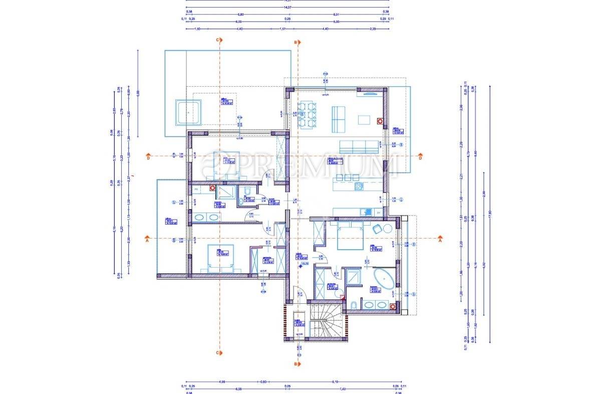 Ukupna neto korisna površina iznosi 193 m² (bruto 251 m²), pri čemu se zatvoreni stambeni prostor obračunava u cijelosti, dok se terase, stubište i spremište obračunavaju prema pripadajućim koeficijentima. Raspored prostorija osmišljen je kako bi pružio maksimalnu funkcionalnost, komfor i osjećaj prostranosti.