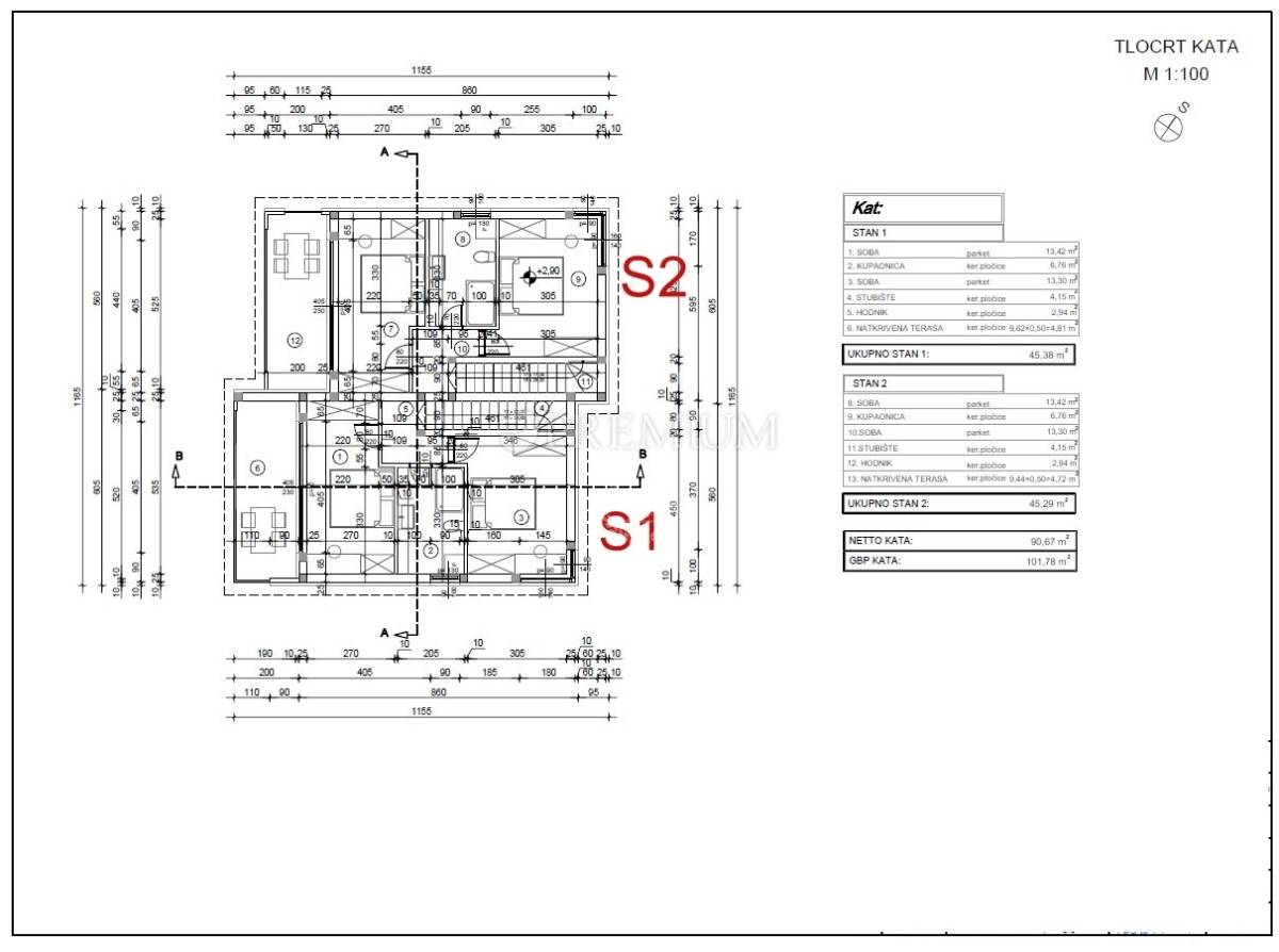 Na katu se smještaju dvije udobne spavaće sobe, hodnik, moderna kupaonica i natkrivena terasa – idealna za jutarnju kavu ili večernje opuštanje na otvorenom.