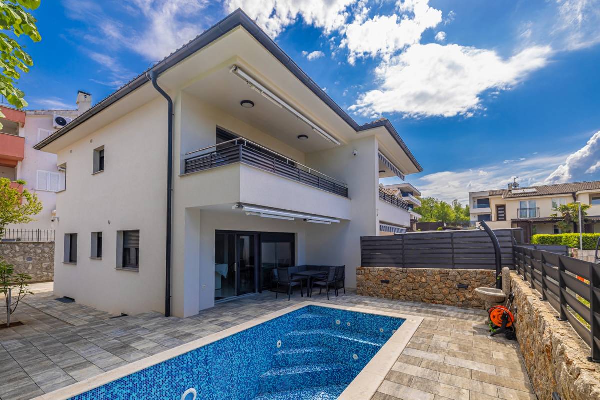 U mirnom dijelu Malinske na otoku Krku smjestila se elegantna dvojna kuća novije gradnje, ukupne stambene površine 128 m². Udaljena svega nekoliko minuta od mora, ova nekretnina nudi savršenu kombinaciju komfora, suvremenih materijala i funkcionalnog rasporeda – s grijanim privatnim bazenom, uređenom i ograđenom okućnicom te dva parkirna mjesta.