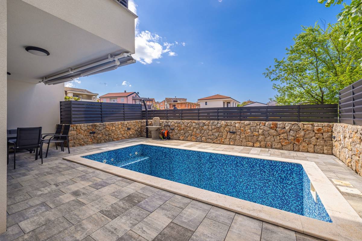 Na ograđenoj okućnici nalazi se grijani bazen sa strojarnicom i sunčalištem, a ispred kuće su osigurana dva parkirna mjesta.