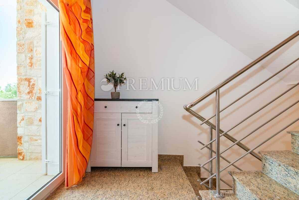 Unutarnje stepenište vodi na prvi kat gdje se nalaze hodnik, dvije kupaonice i dvije spavaće sobe. Obje sobe imaju izlaz na veliku terasu površine 42 m² s koje se pruža prekrasan pogled na more.