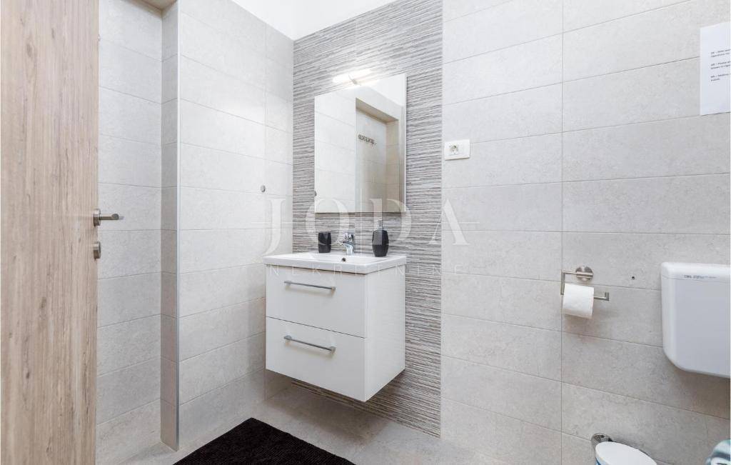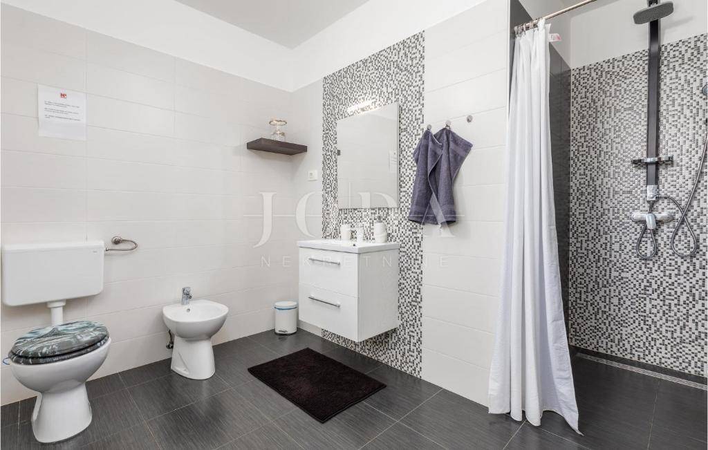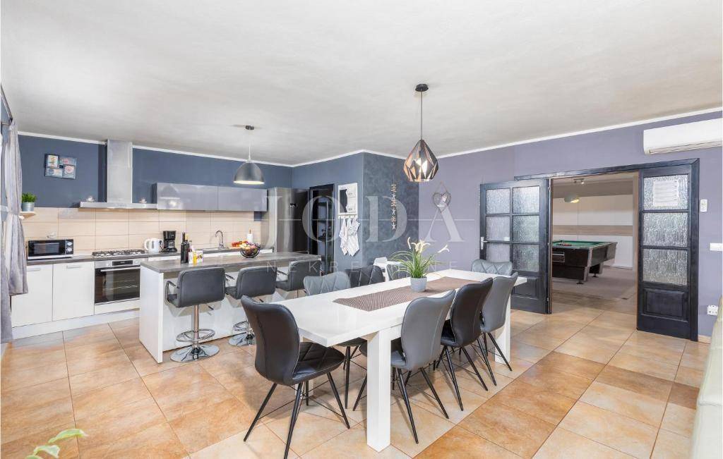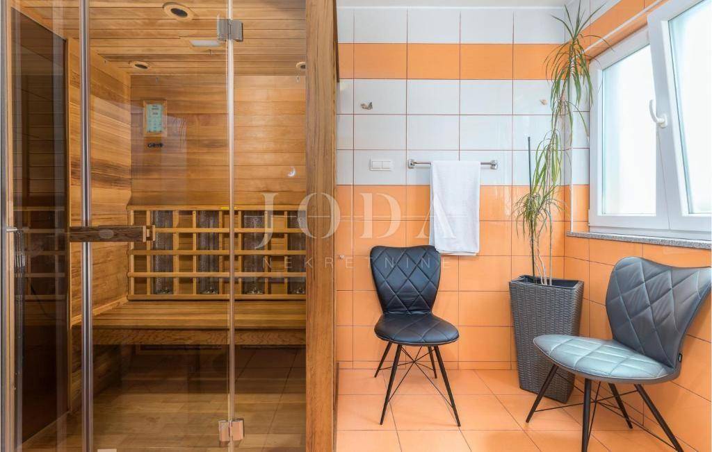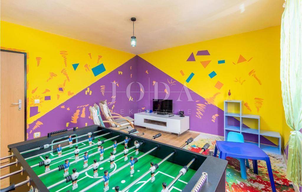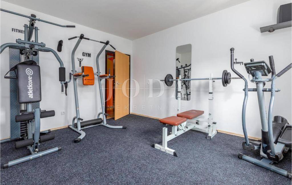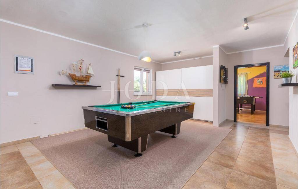 Građena kao katnica, u prizemlju se nalazi kuhinja sa blagovaonom, prostrani dnevni boravak, soba za zabavu, igraonica za djecu, fitnes, sauna i kupaona.