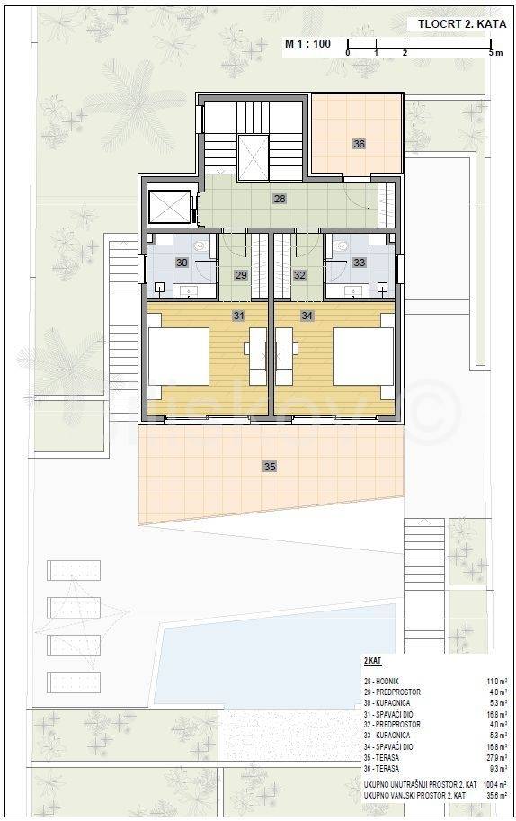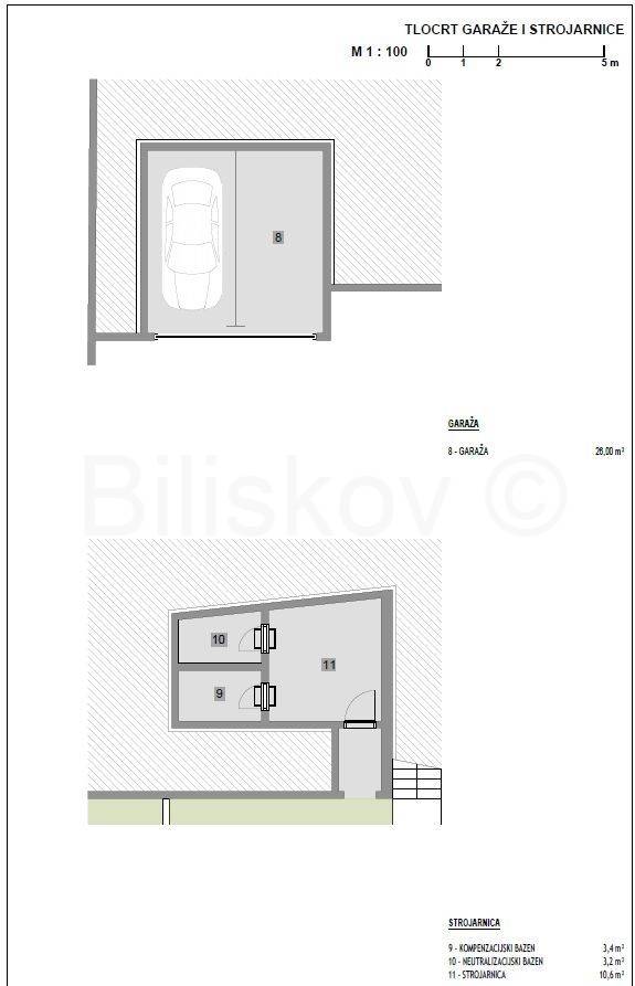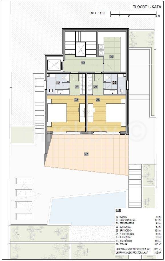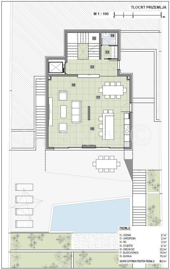 Građevna čestica se nalazi u izgrađenom građevinskom području, mješovita namjena (pretežno stambena). Namjena buduće građevine je obiteljska stambena kuća, katnosti E=P+2.Osim građevine osnovne namjene na čestici su i dvije pomoćne građevine:- garaža- vanjski otvoreni bazen s ukopanim pripadajućim tehničkim prostorima – strojarnica,kompenzacijski i neutralizacijski bazenPomoćne građevine su konstrukcijski dilatirane kako međusobno tako i od građevine osnovne namjene.Svaka građevina je samostojeća.Prizemna etaža stambene kuće se sastoji od ulaznog prostora s pripadajućom garderobom i WC-om, vertikalnih komunikacija, te dnevnog boravka, kuhinje i blagovaonice. Iz svih dnevnih prostora omogućen je kontakt s vanjskim prostorom preko ostakljenih stijena. Na otvorenom prostoru prizemne etaže, planiran je vanjski, otvoreni bazen poligonalnog tlocrta, maksimalnih dimenzija 840 x 370 cm.Komunikacija s gornjim katovima ostvarena je unutarnjim stubištem i dizalom.Na 1. katu kuće nalaze se gospodarska prostorija, te dvije spavaće sobe s pripadajućim sanitarijama i garderobnim ormarima, obje imaju pristup jugozapadnom balkonu.Na 2. katu kuće nalaze se terasa na sjeveroistoku, te dvije spavaće sobe s pripadajućim sanitarijama i garderobnim ormarima, obje imaju pristup jugozapadnom balkonu.