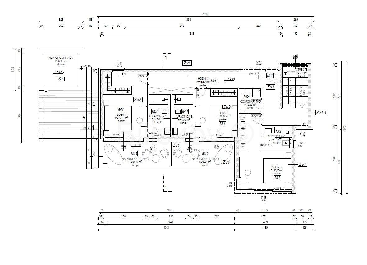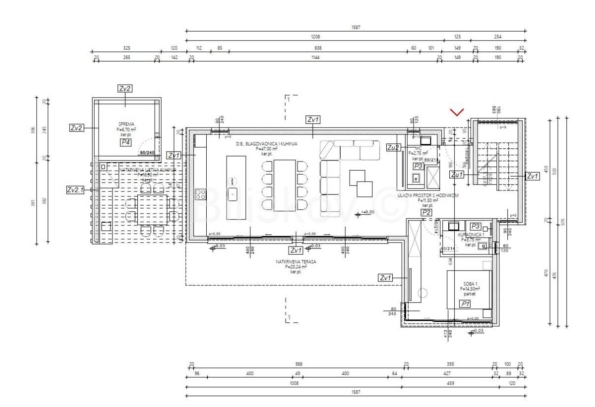 Uprizemlju se također nalazi spavaća soba s vlastitom kupaonicom i direktnim izlazom na terasu te gostinjski WC u ulaznom dijelu.