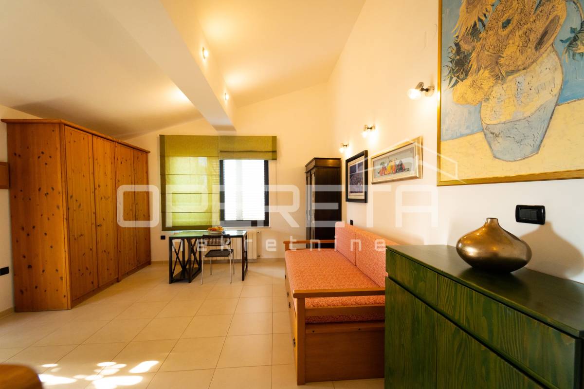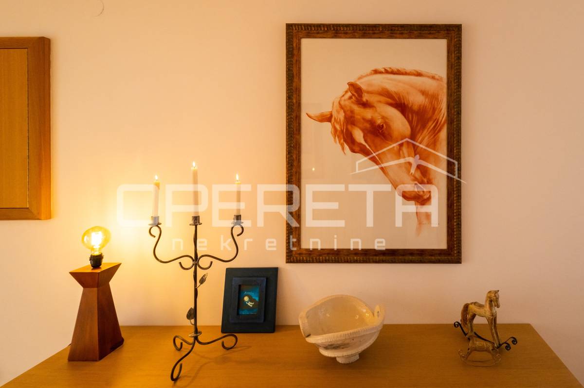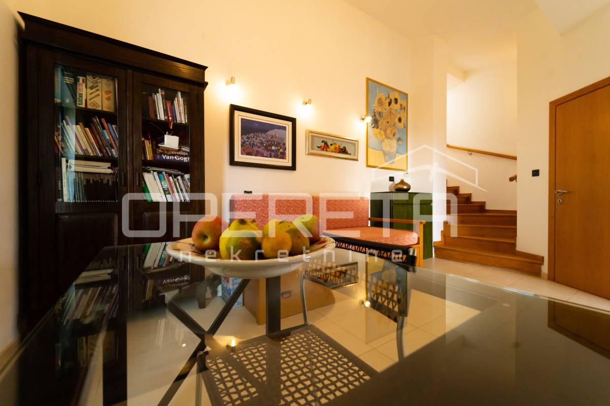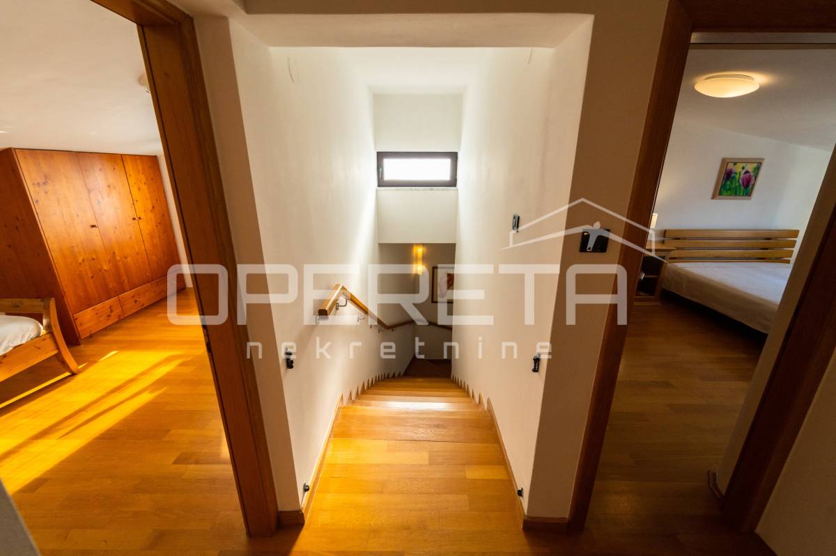 Stan se prostire na dvije etaže. Na prvoj etaži nalazi se ulazni hall s praktičnim vešerajem, dok se na drugoj etaži nalazi prostrani dnevni boravak s izlazom na veliku terasu koja pruža predivan pogled. Dnevni prostor povezan je s kuhinjom i blagovaonicom, a dodatno se na toj etaži nalaze tri spavaće sobe i kupaonica.