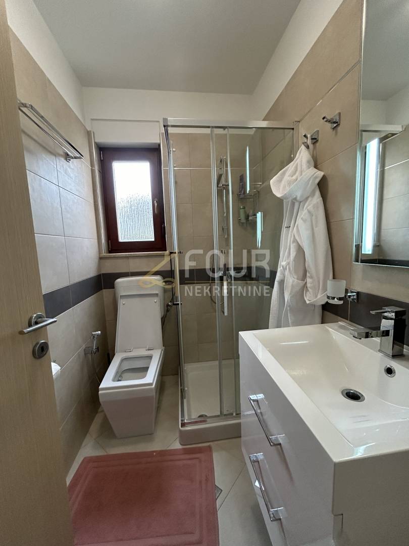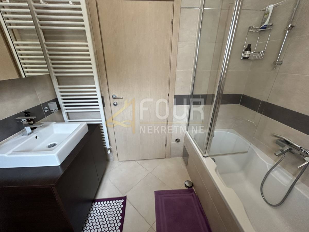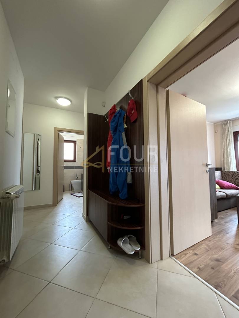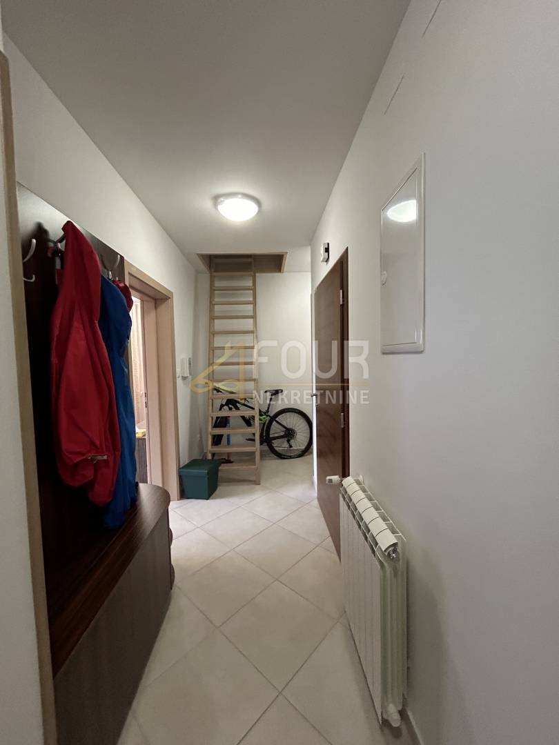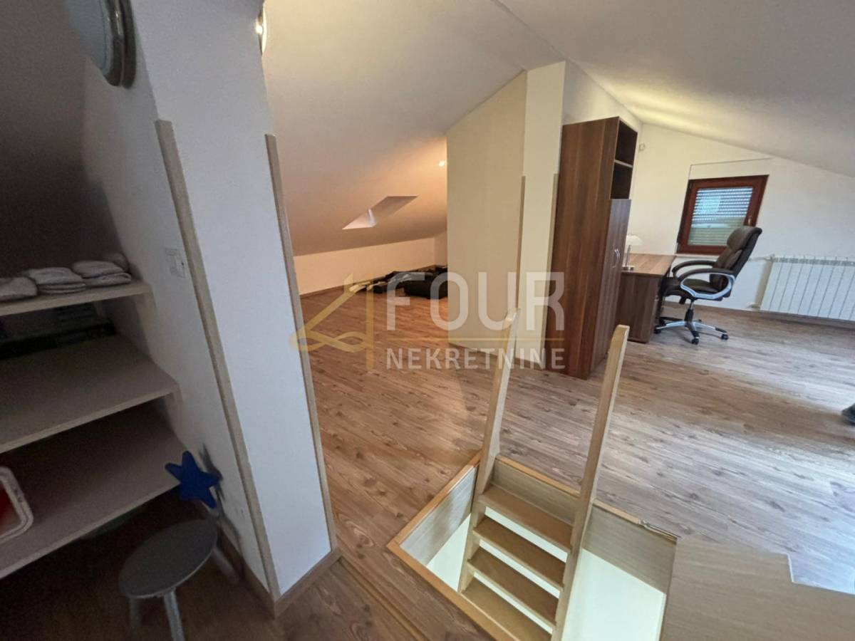 Stan se sastoji od ulaznog hodnika, tri sobe, dnevnog boravka, kuhinje, kupaonice, dodatne tuš kupaonice, izbe te lođe, s pripadajućim dijelovima balkonom i tavanom, čime ukupna površina iznosi 127,71 m2. Prostor je ugodan za boravak, potpuno namješten i spreman za useljenje, a dodatnu udobnost osiguravaju centralno grijanje i klima uređaj.