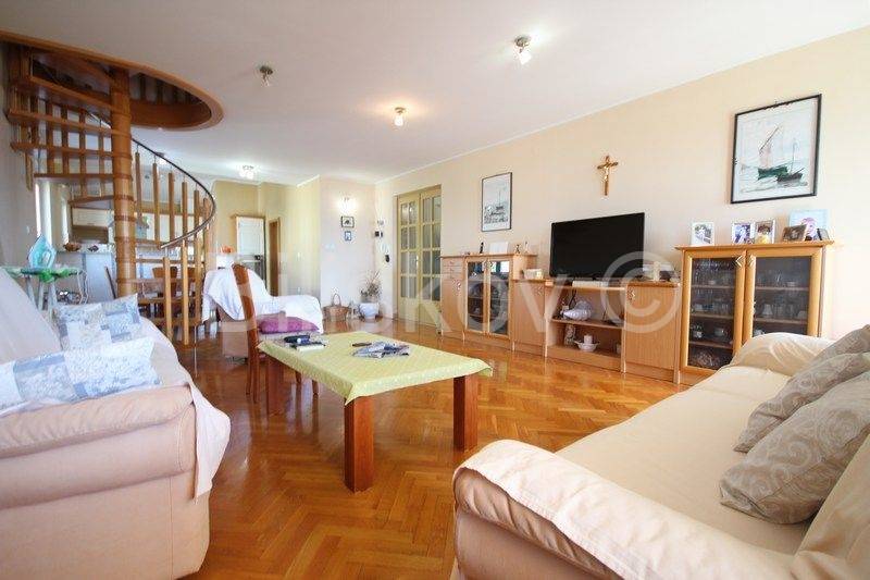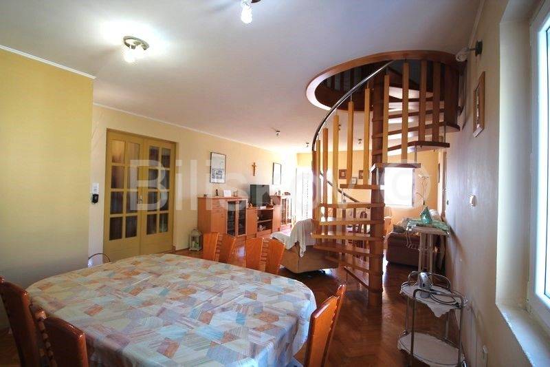 U dnevnom boravku nalaze se spiralne stepenice koje vode u visoko potkrovlje.