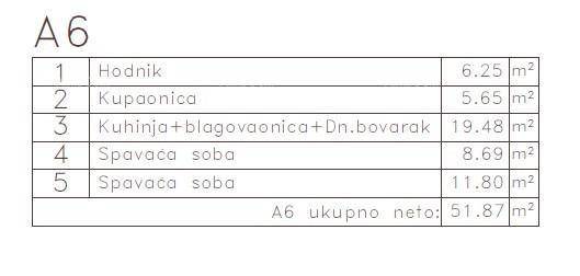 hodnika, kupaonice, kuhinje + blagovaonice, dnevnog boravka, 2 spavaće sobe. Ukupna neto površina: 51,87 m2