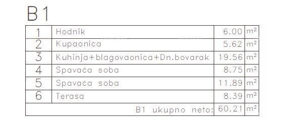 hodnika, kupaonice, kuhinje + blagovaonice, dnevnog boravka, 2 spavaće sobe i terase. Ukupna neto površina: 60,21 m2