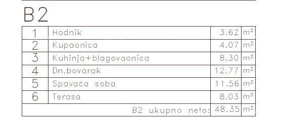 hodnika, kupaonice, kuhinje + blagovaonice, dnevnog boravka, spavaće sobe i terase. Ukupna neto površina: 48,35 m2