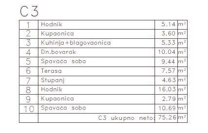hodnika, 2 kupaonice, kuhinje + blagovaonice, dnevnog boravka, 2 spavaće sobe i terase. Ukupna neto površina: 75,26 m2