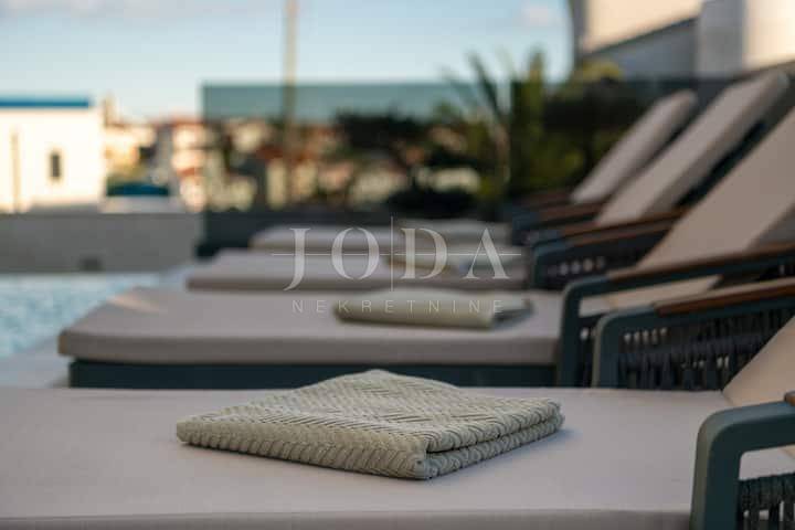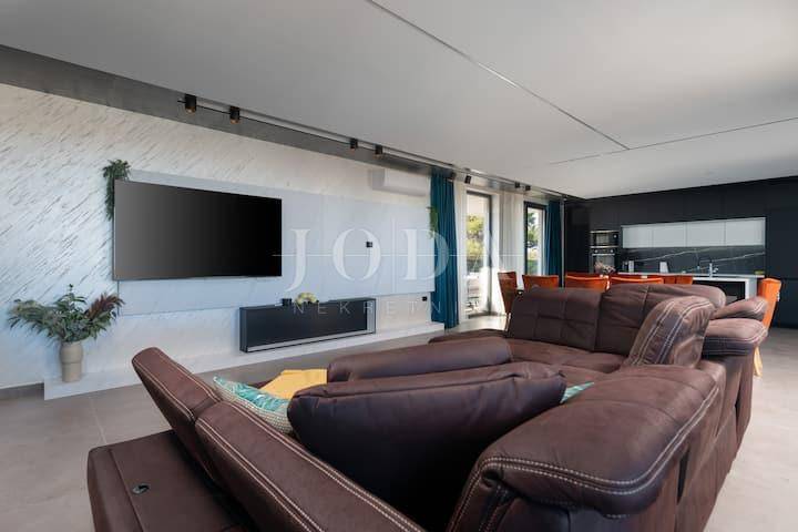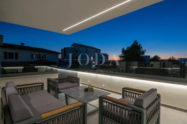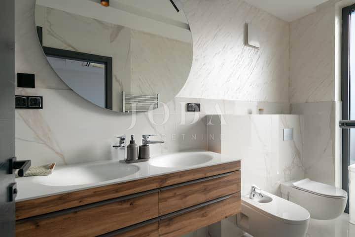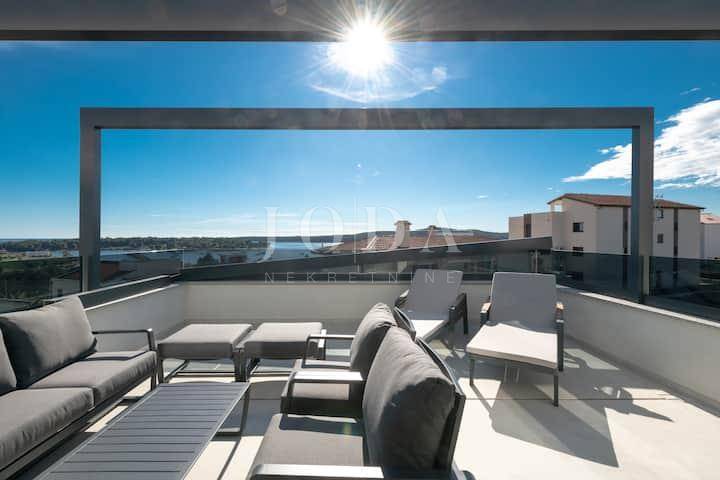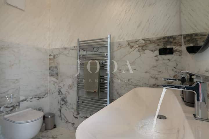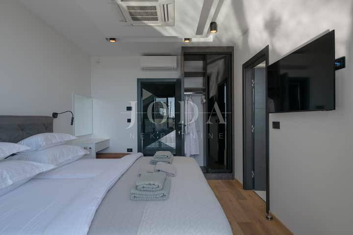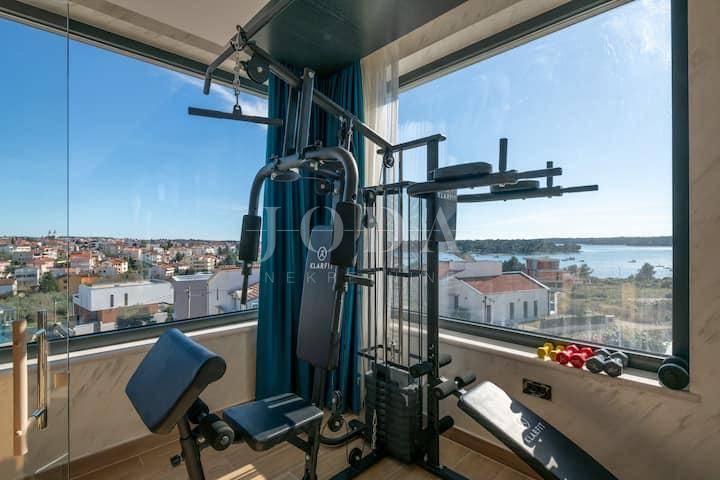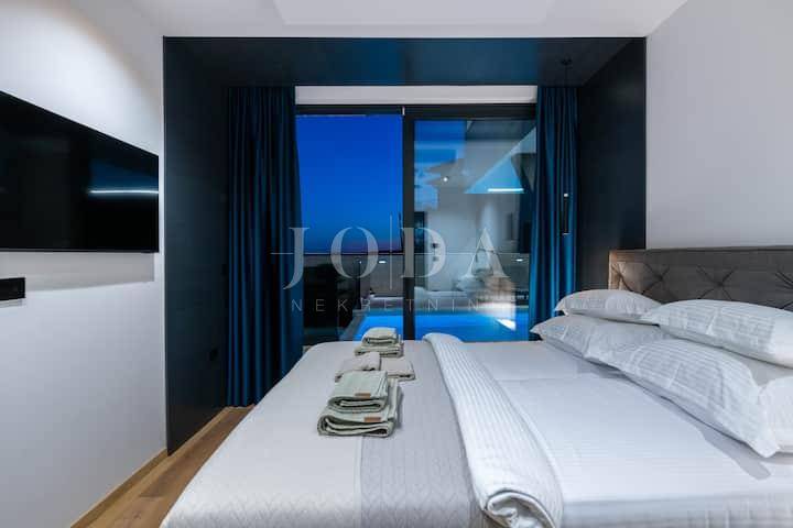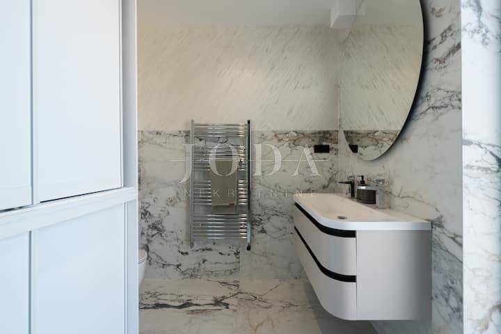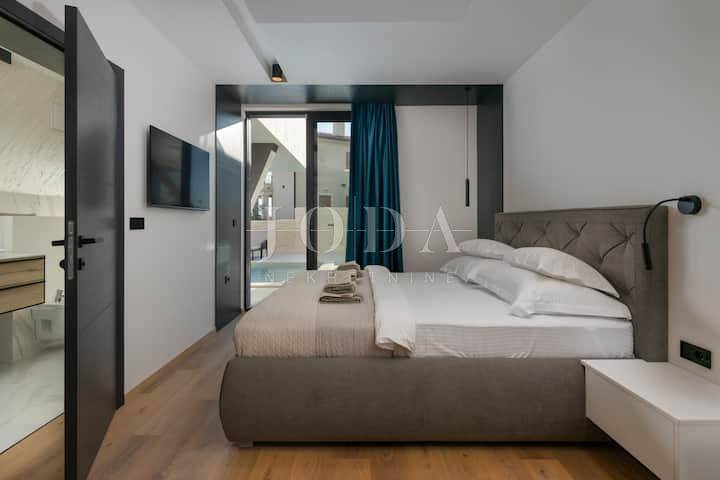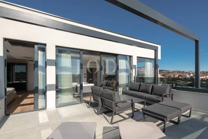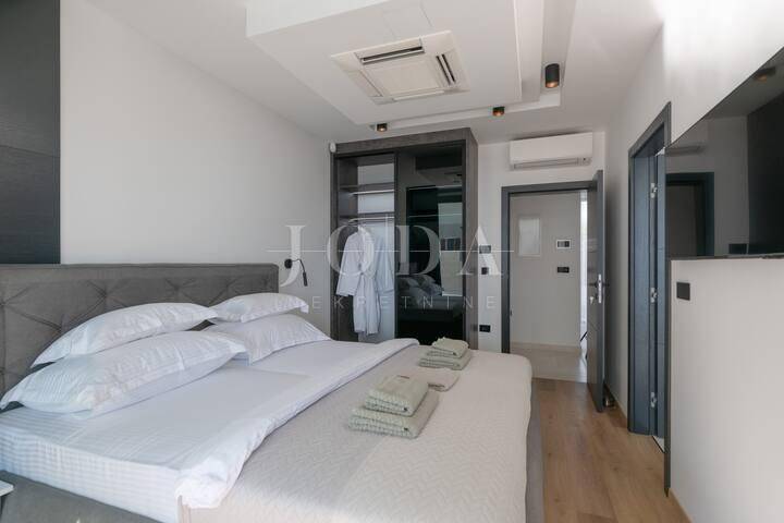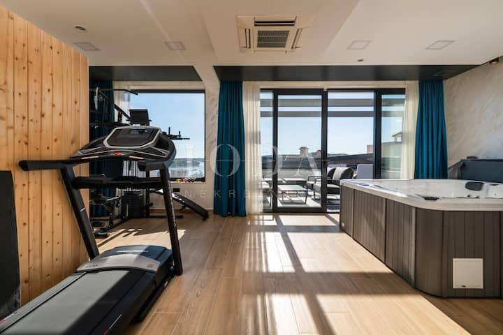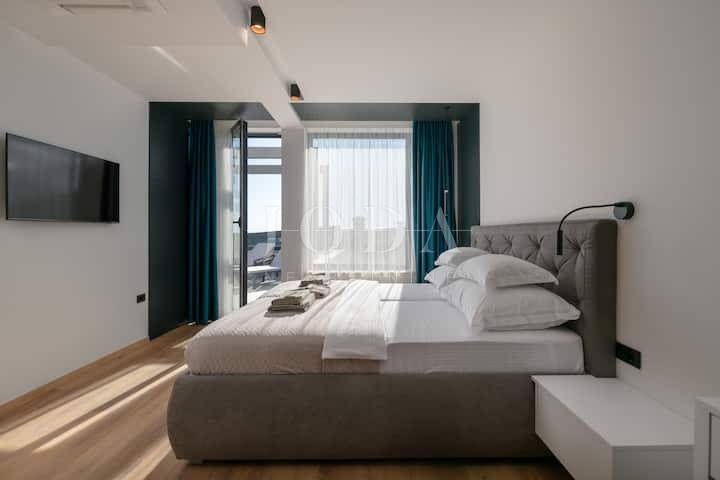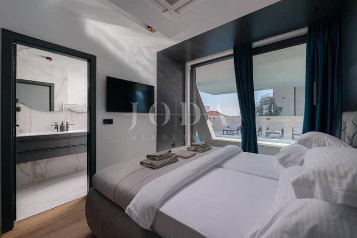 Na vrhu još jedna spavaća soba sa kupaonicom te veliki prostor welness zone i krovne terase sa prekrasnim pogledom na more.