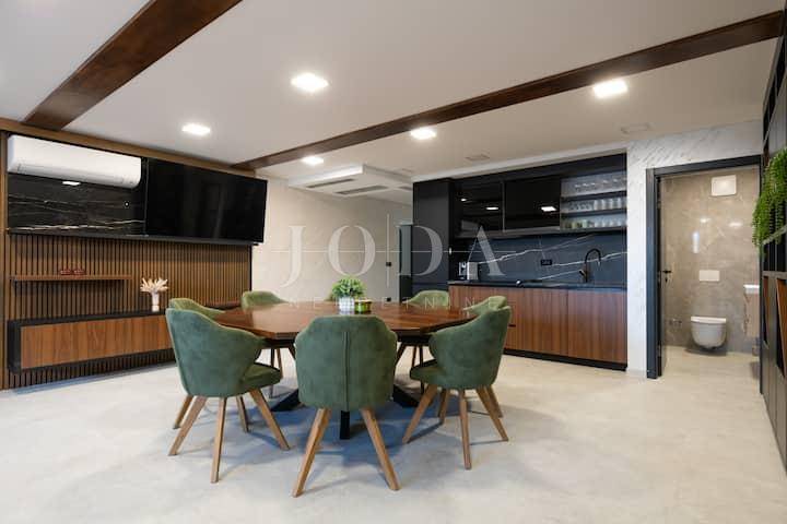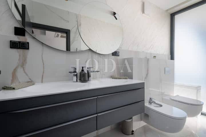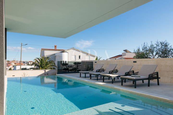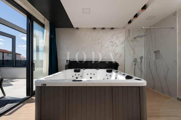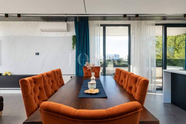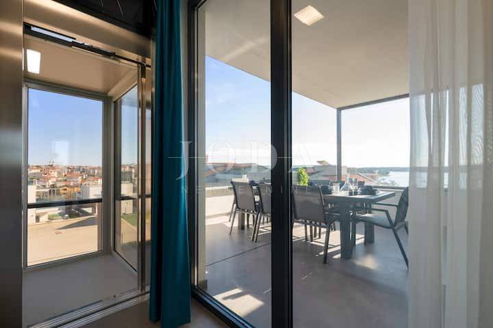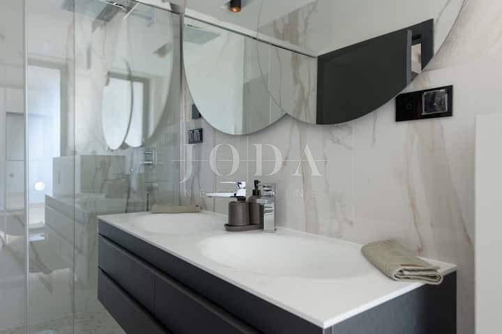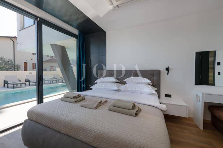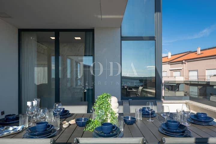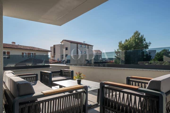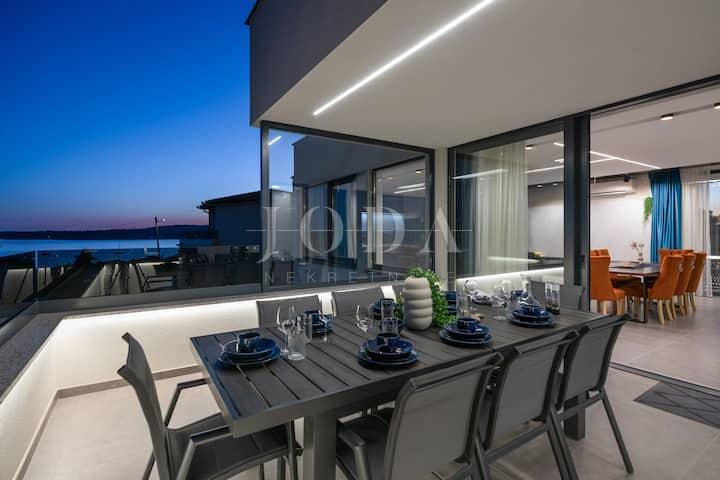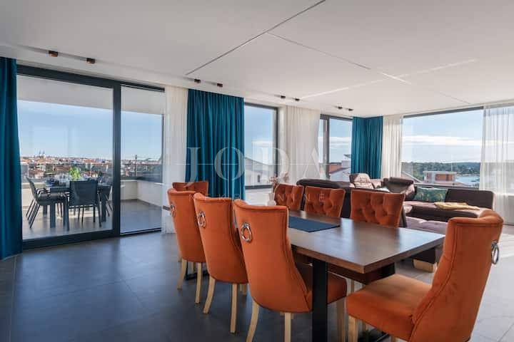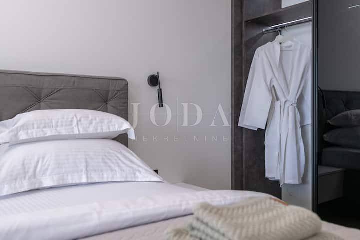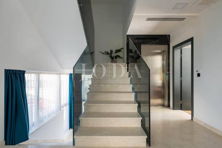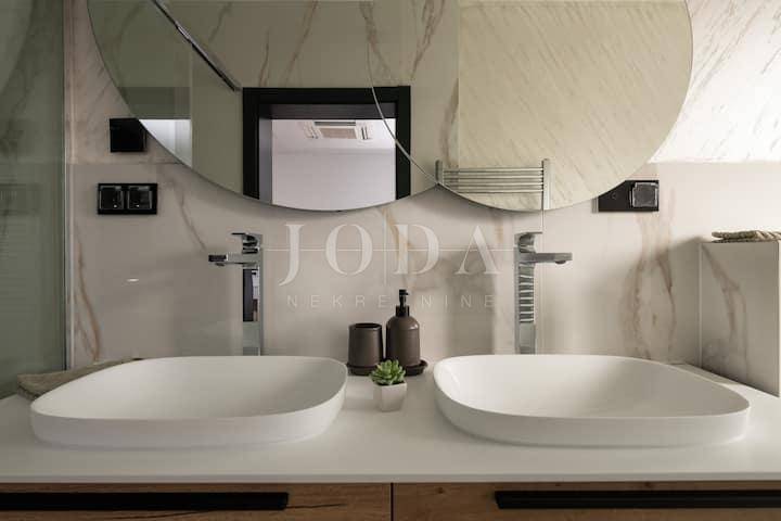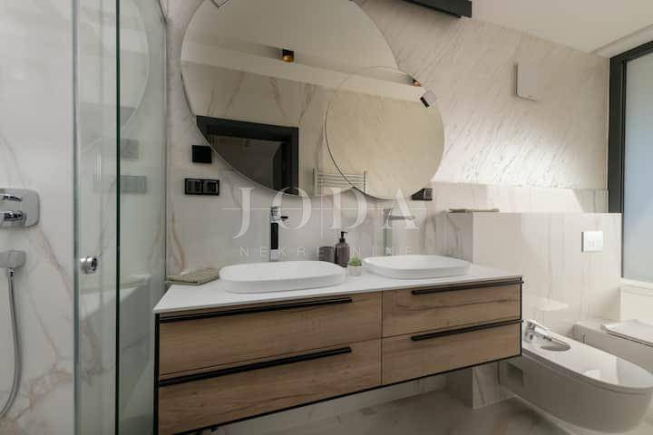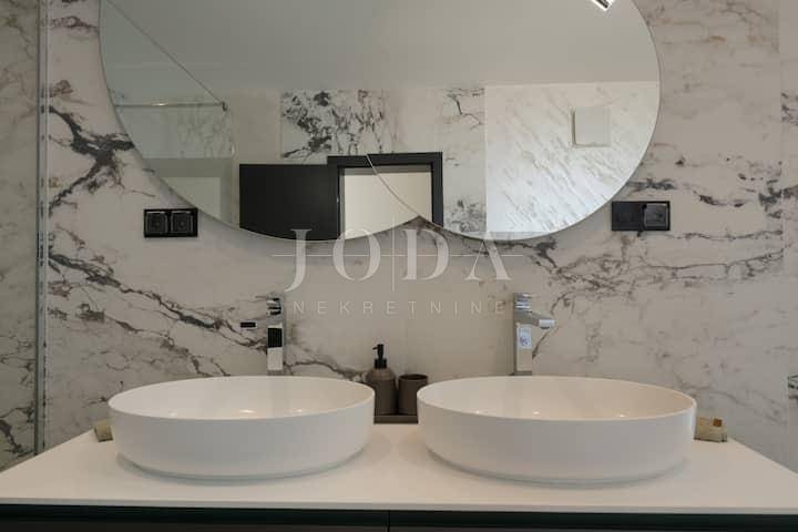 Na vrhu još jedna spavaća soba sa kupaonicom te veliki prostor welness zone i krovne terase sa prekrasnim pogledom na more.