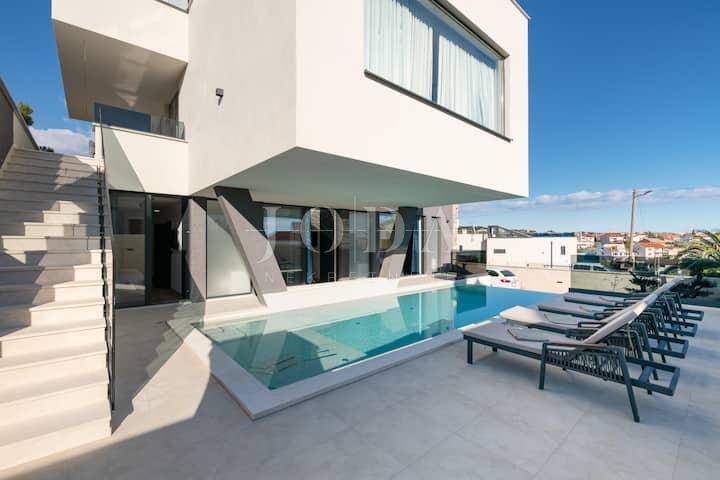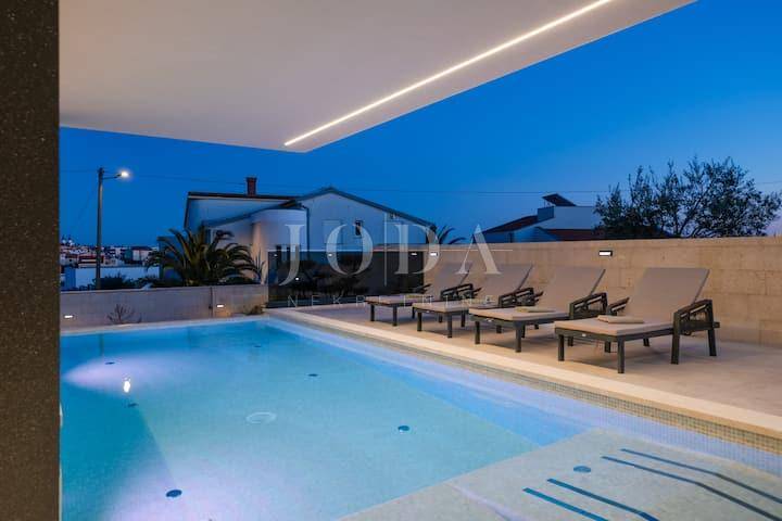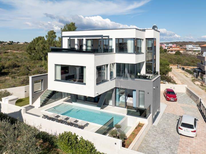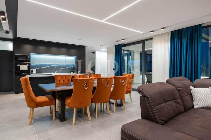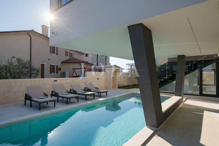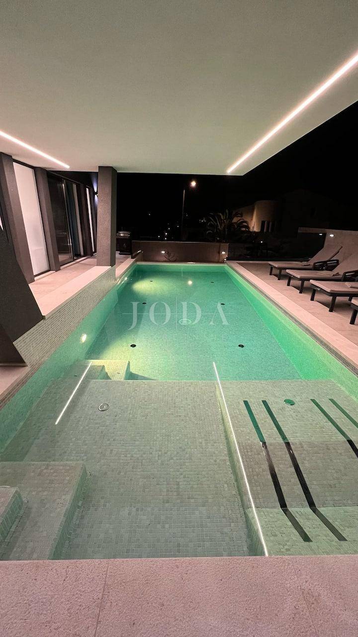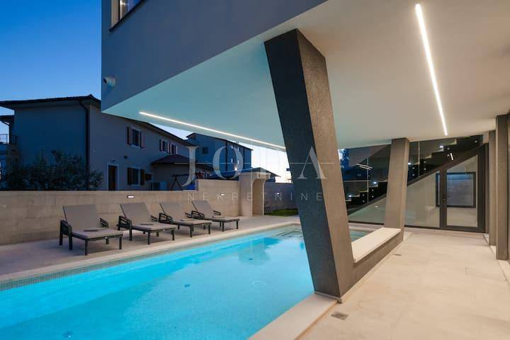 Kuća je potpuno namještena i opremljena,dizalice topline za grijanje i hlađenje,klimatizacije svake sobe,namještaj i stolarija po mjeri i narudžbi,kameni podovi ,dvostruke staklene ograde na unutarnjem stubištu i vanjskim terasama.Unutar okućnice 4 parkirna mjesta sa dva punjača za elektro vozila.