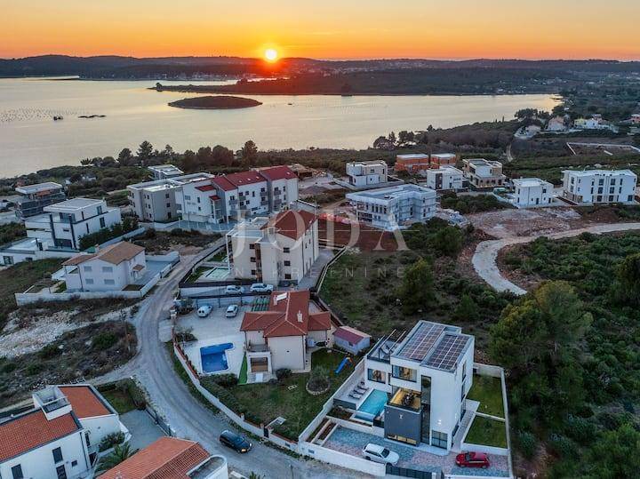 Smještena na super lokaciji 200 metara od plaže i marine,u okruženju sličnih modernih kuća prodaje se ova samostojeća kuća sa visokokvalitetnim materijalima interijera i eksterijera.