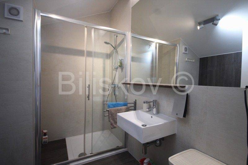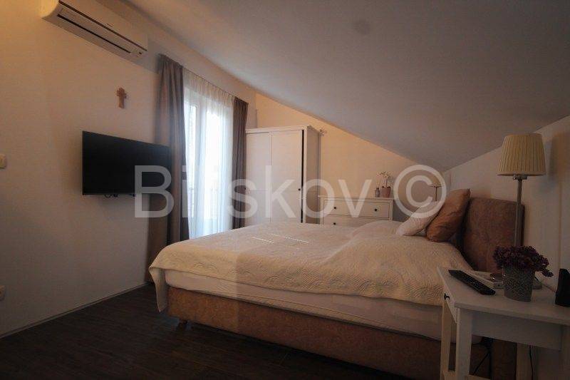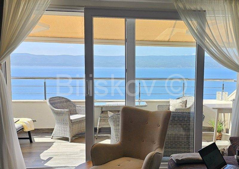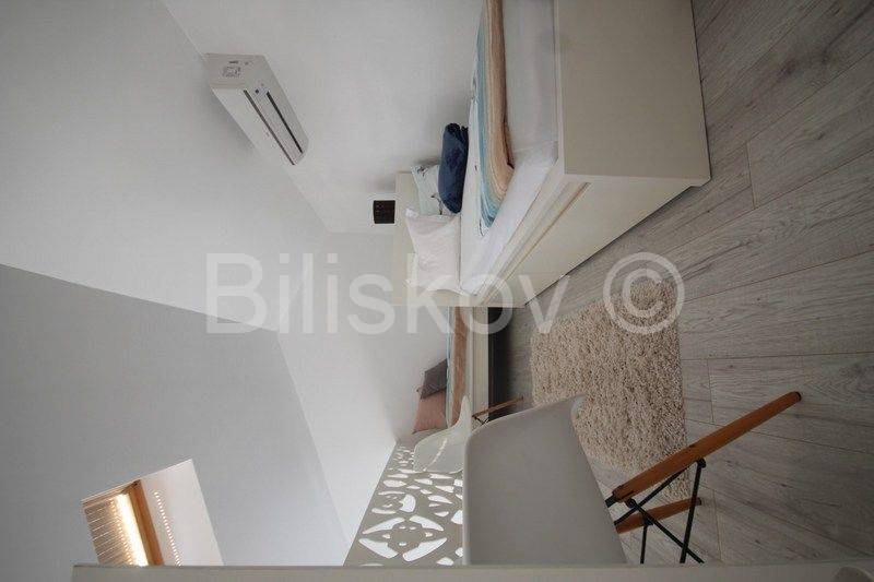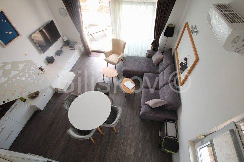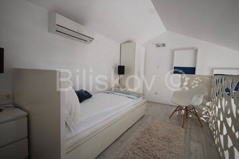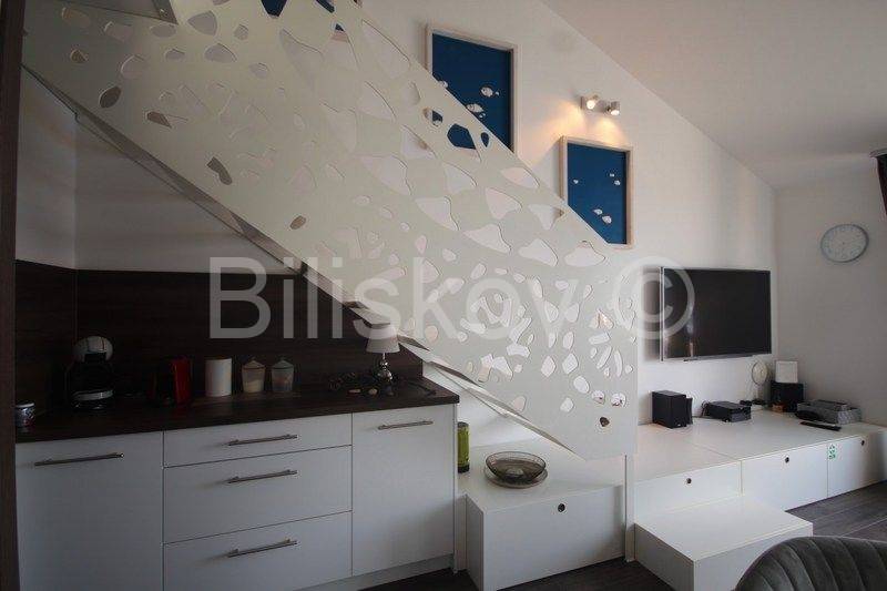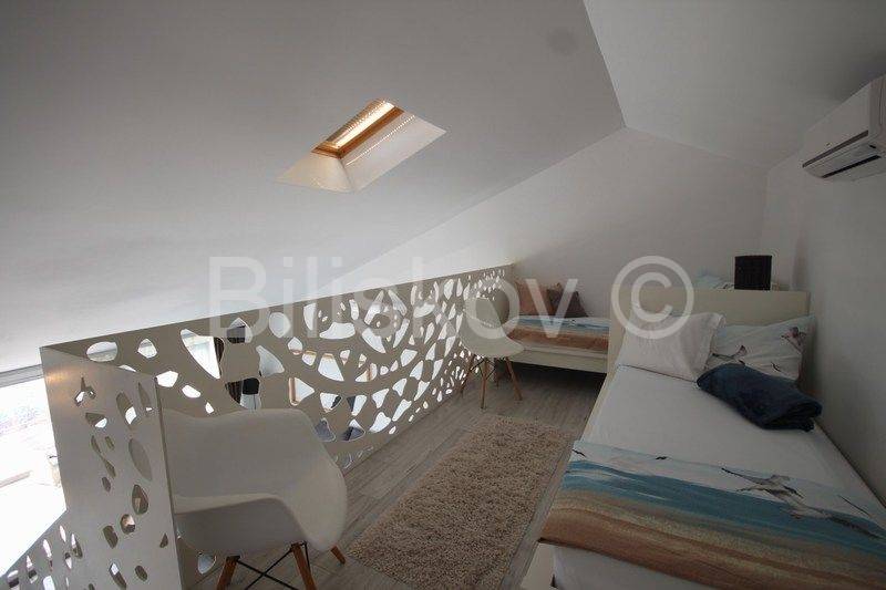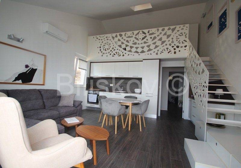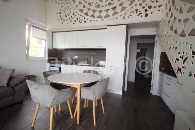 Omiška Rivijera, Mimice - lijepo i moderno uređen dvosoban stan s pogledom na moreU elegantnoj zgradi prodajemo dvosoban stan 87m2 (obračunato s terasom, parkingom i spremom po koeficijentu).Stan se nalazi na 4. katu (zadnjem) u zgadi s liftom.Stan se sastoji od kuhinje po mjeri s modernim uređajima i velikim hladnjakom, dnevnim boravkom s galerijom, spavaće sobe s vlastitom kupaonicom, manje sobe koja se nalazi na galeriji, velike kupaonice, prostrane lijepe terase koja se potpuno prekriva s motornom tendom koja se uvlači u kutiju i manje lođe.Termo zavjese na prozorima štite od topline i jakog sunca.Svaka soba ima klima uređaj.Ograda na galeriji je u obliku paške čipke, umjetničke slike na zidovima i neobično izveden krov galeriji koji podsjeća na unutrašnjost male kućice su samo neki od detalja koji ovaj stan čine posebnim i čime se on razlikuje od većine stanova na tržištu.Stan je lijepo uređen i prodaje se kompletno namješten.Iz garaže je prilaz stanu omogućen liftom.Uz stan se prodaje i jedno parkirno mjesto u podzemnoj garaži.U zajedničko vlasništvo zgrade pripada grijani bazen i jacuzzi iz kojih se pruža opuštajući pogled na more.Također u zajedničkom vlasništvu zgrade je mjesto za roštilj, vanjski tuš i vešeraj.Stan je idealan za bavljenje turističkim najmom, svi vlasnici rade s jednom agencijom koja je u prizemlju ima recepciju za usluge turistima.