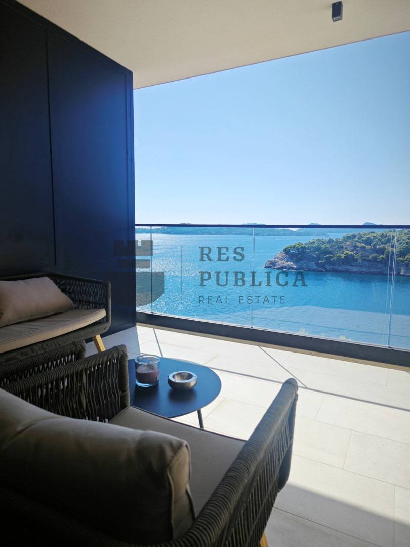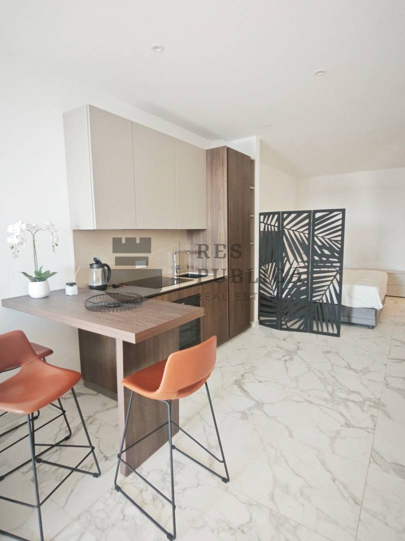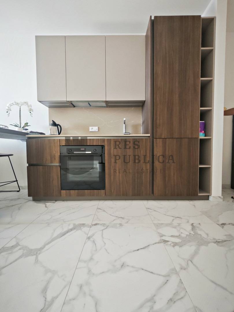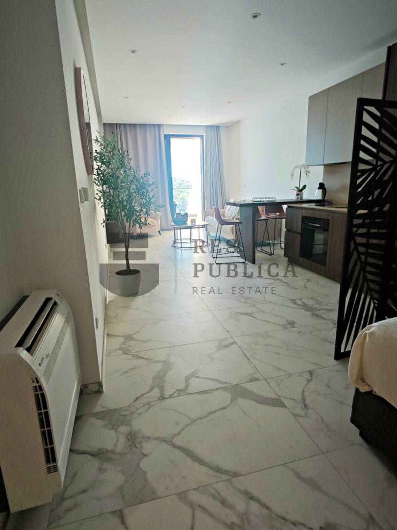 Apartman ima loggiu od 9,21 m² s koje se pruža otvoren pogled na more, a uz stan dolazi i vlastito parkirno mjesto. Prostor je moderno organiziran kao open space koji uključuje kuhinju, blagovaonicu, dnevni boravak i spavaći dio u jednoj cjelini, dok je kupaonica odvojena i opremljena podnim grijanjem.