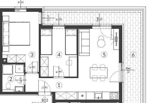 Stan B12, površine 54.84 m2, nalazi se na 2 katu zgrade i sastoji se od: hodnik+garderoba, dnevni boravak sa kuhinjom i blagovaonicom, 2 spavaće sobe, kupatila i natkrivene terase.